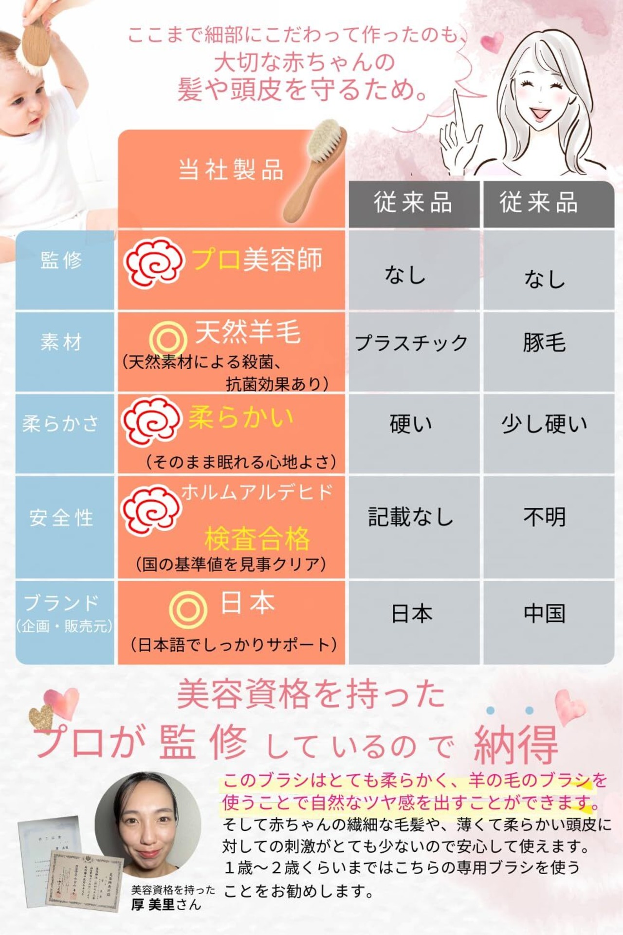 【美容師監修】子どもの髪にも詳しい資格を持った美容師が監修。いろいろな髪のトラブルを見てきたからこそbabyブラシを推奨しています。自身も二児の母として子育てに関わっているからこそ、大切な赤ちゃんの頭皮を守るNokpenpenのbaby hair brushを監修してくれました。