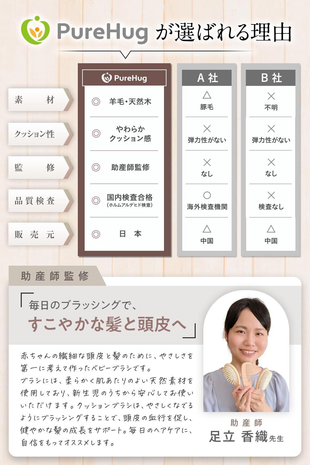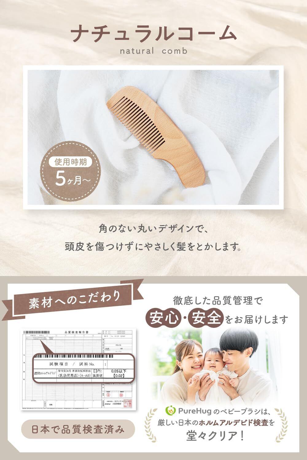 【安心・安全の天然素材】PureHug ベビーブラシは厳しい日本のホルムアルデヒド検査を堂々クリア!肌に優しい羊毛と天然木を使用した素材で赤ちゃんの敏感な肌にも安心してお使いいただけます。