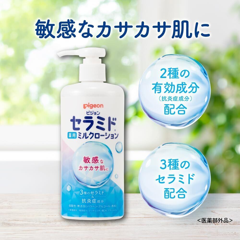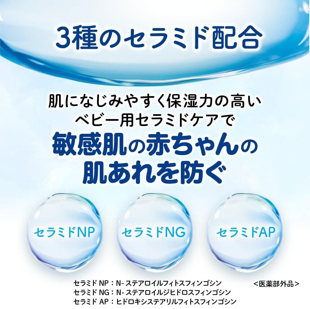 敏感なカサカサ肌に <薬用ミルクローション(セラミド)300gの特長> ●敏感肌の赤ちゃんの肌あれを防ぐ薬用スキンケア ●3種のセラミド※(保湿成分)と2種の有効成分配合 ●皮フ科医による皮フ刺激性テスト済み (すべての方に皮フ刺激が発生しないということではありません) ※N-ステアロイルフィトスフィンゴシン、ヒドロキシステアリルフィトスフィンゴシン、N-ステアロイルジヒドロスフィンゴシン 弱酸性・無添加(パラベン・アルコール・香料)