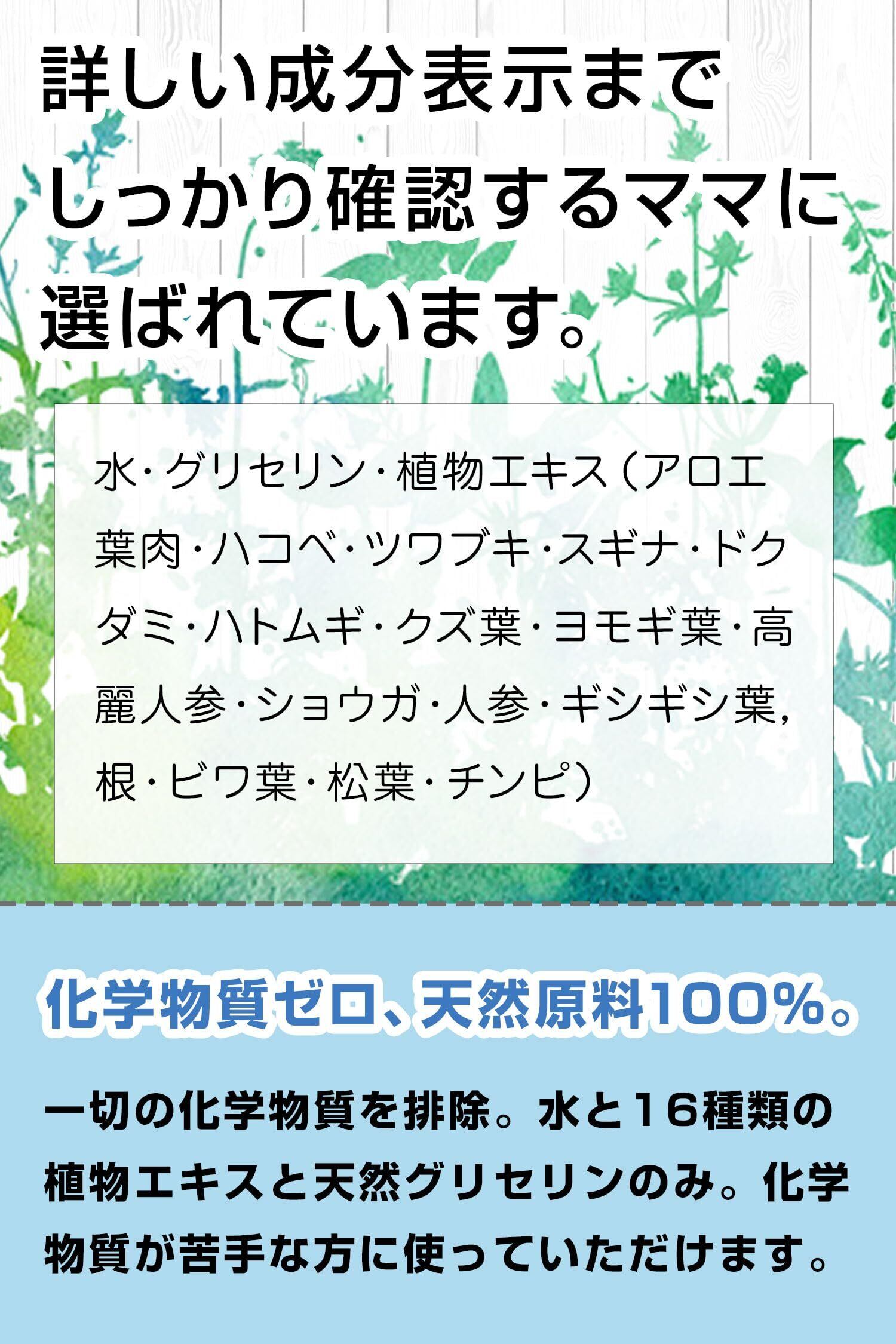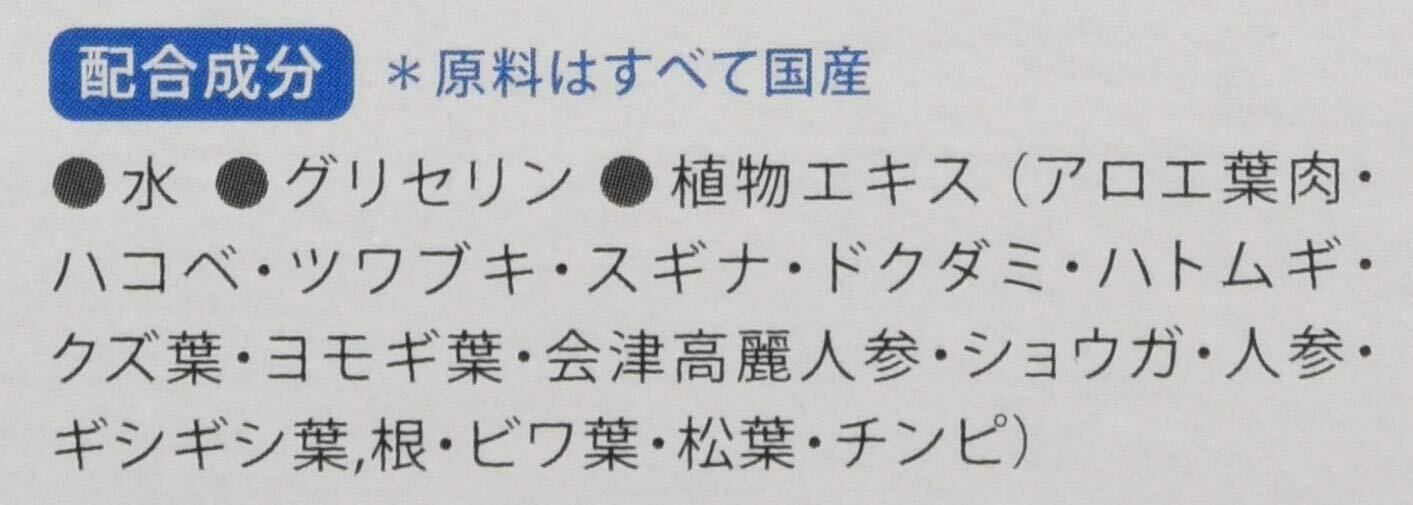 水・グリセリン・植物エキス(アロエ葉肉・ハコベ・ツワブキ・スギナ・ドクダミ・ハトムギ・クズ葉・ヨモギ葉・会津高麗人参・ショウガ・人参・ギシギシ葉,根・ビワ葉・松葉・チンピ)
