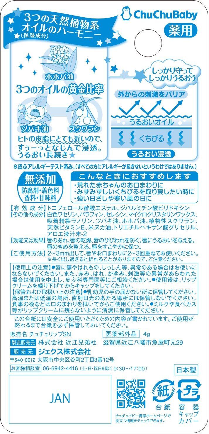 【特価商品】チュチュベビー 薬用やわらかチュチュリップ【新生児~ 無添加(防腐剤・着色料・香料・甘味料)赤ちゃんの皮脂に近い成分】