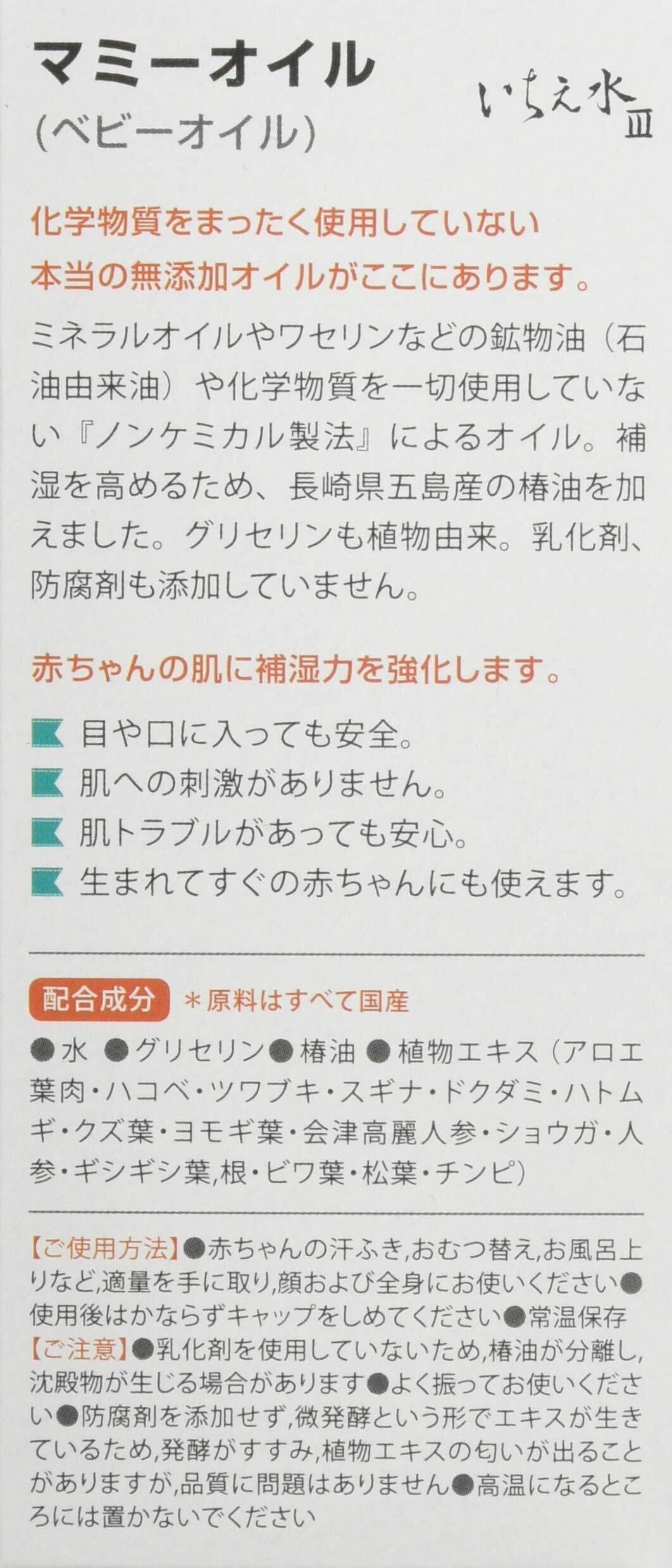 乳化剤(界面活性剤)を使用していないベビーオイル。全身を補湿できます。マミーウォーターと合わせてのご使用で保湿の強化にも。