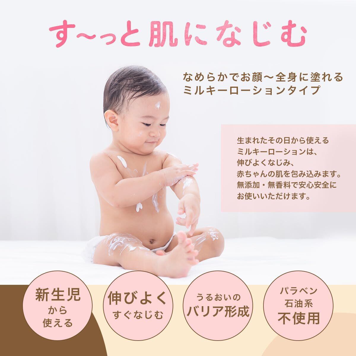 【なめらかにお顔〜全身へ】生まれたその日から使えるミルキー ローション は、伸びよくなじみ、赤ちゃんの肌を包み込みます。 無添加 ・ 無香料 で安心安全にお使いいただけます。