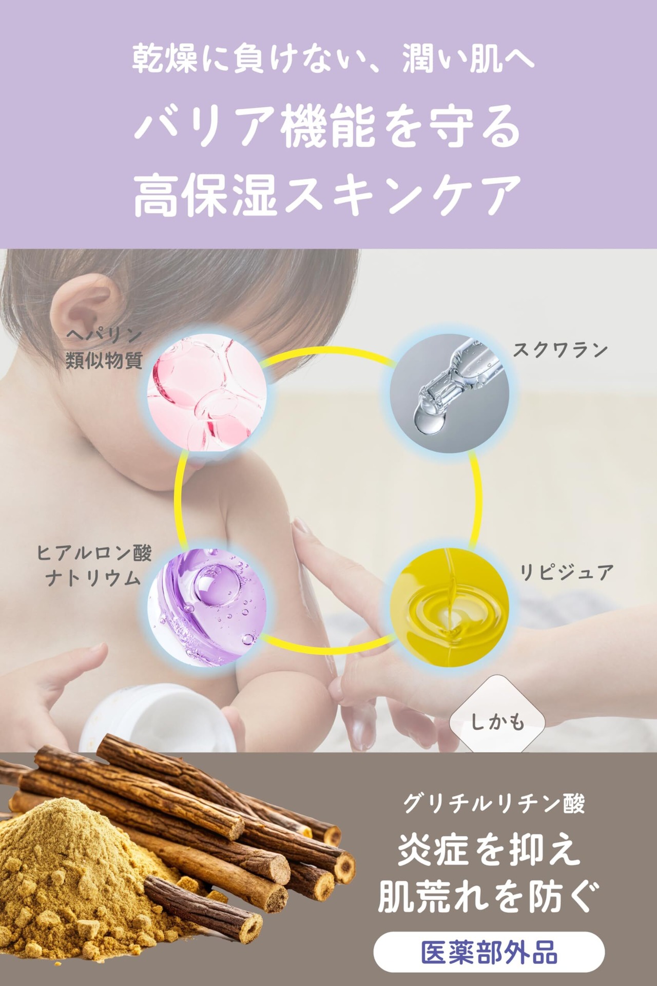 【ベビー用保湿クリームは薬用成分配合で健やかな肌を保ちます】 Japan Skin Careのベビークリームは薬用成分配合。ヘパリン類似物質による高い保湿効果と、グリチルリチン酸ジカリウムによる抗炎症効果により、バリア機能が未熟な赤ちゃんの肌を健やかに保つ赤ちゃん用ボディクリームです。