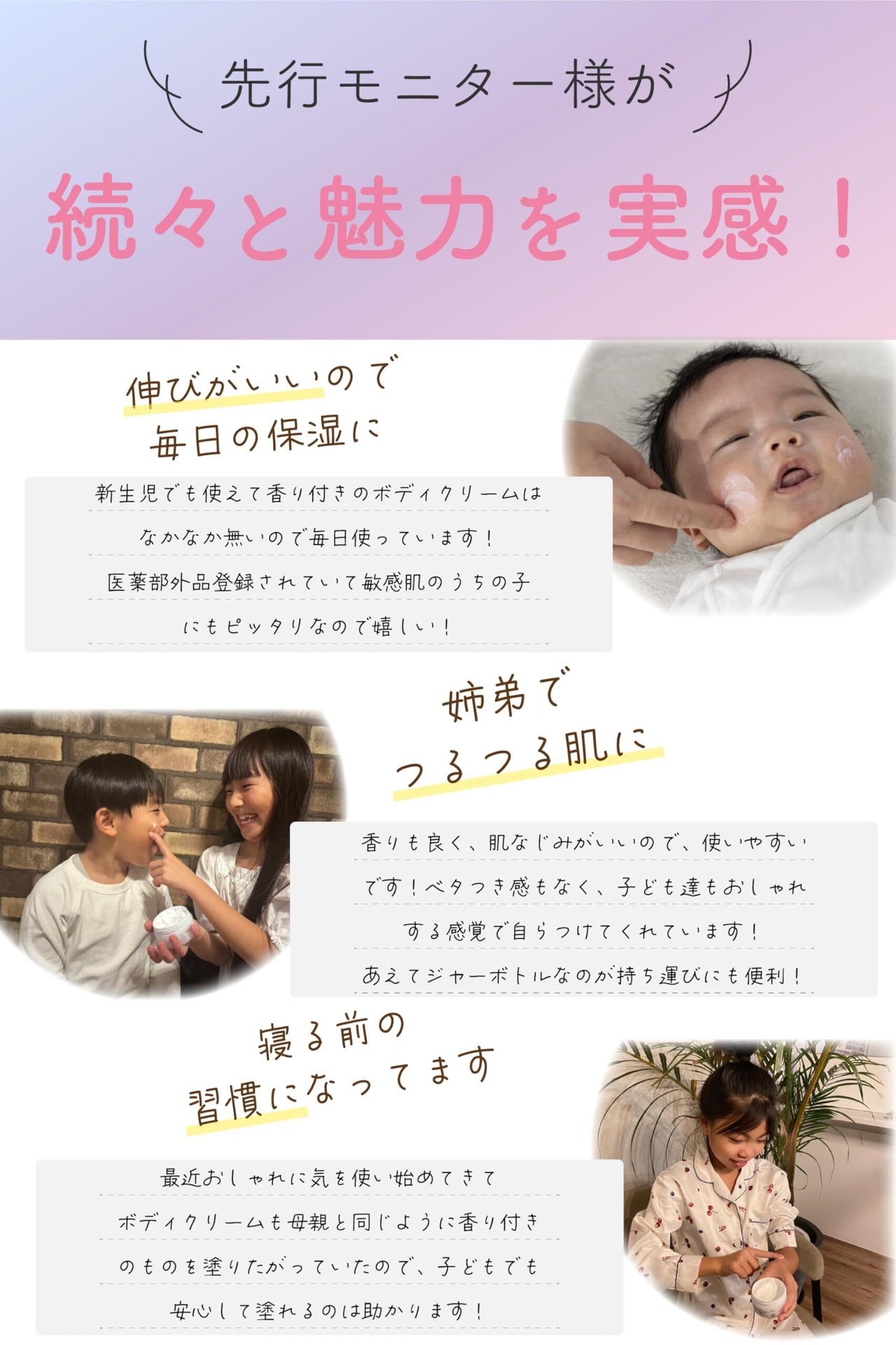 【子供や敏感肌の方にもおすすめのボディクリーム】 ・生まれたばかりの赤ちゃんの保湿はもちろん、子供やママ、パパのボディクリームとしてもご使用いただけます。子供や敏感肌の方など、肌にやさしいボディクリームをお探しの方におすすめの薬用ボディクリームです。