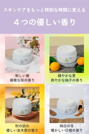 【4つの香りで赤ちゃんの保湿の時間を特別なものに】 Japan Skin Careのベビークリームは日本の四季を表現する4つの香りをお選びいただけます。 ベビークリームのそれぞれの香りが、赤ちゃんと過ごす季節ごとの思い出を彩り、日々の保湿の時間を楽しく豊かなものにします。