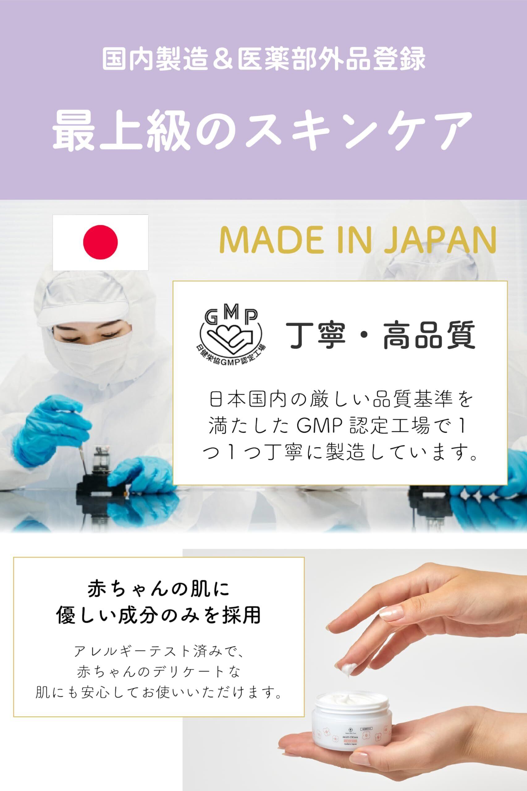 【Japan Skin Careのベビー用保湿クリームはアレルギーテスト済み】 Japan Skin Careでは赤ちゃんの健康と安全を最優先に考えたベビークリームなどの製品をつくっています。ベビー用保湿クリームはアレルギーテスト済み。だから、赤ちゃんのデリケートな肌にも安心してお使いいただけるボディクリームです。