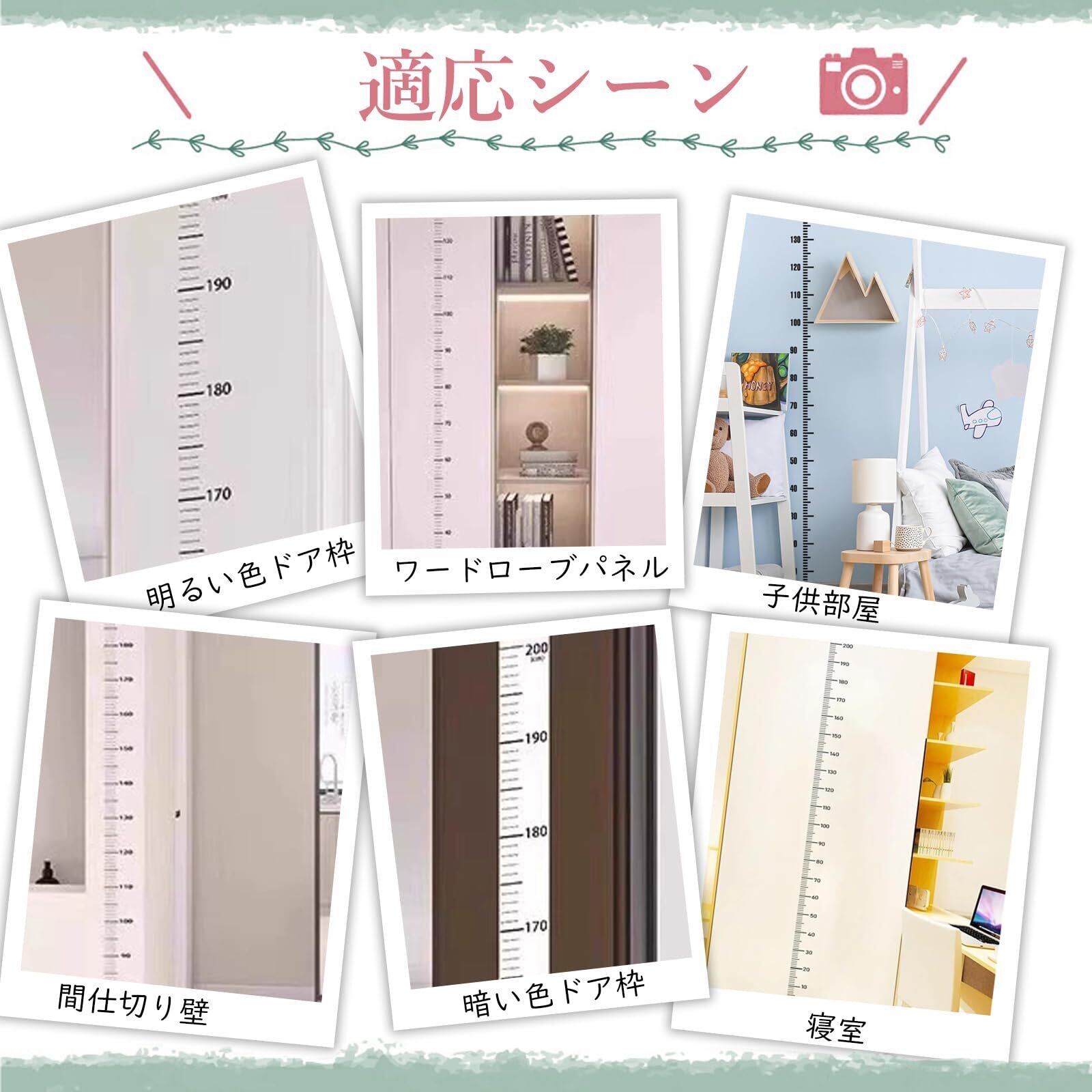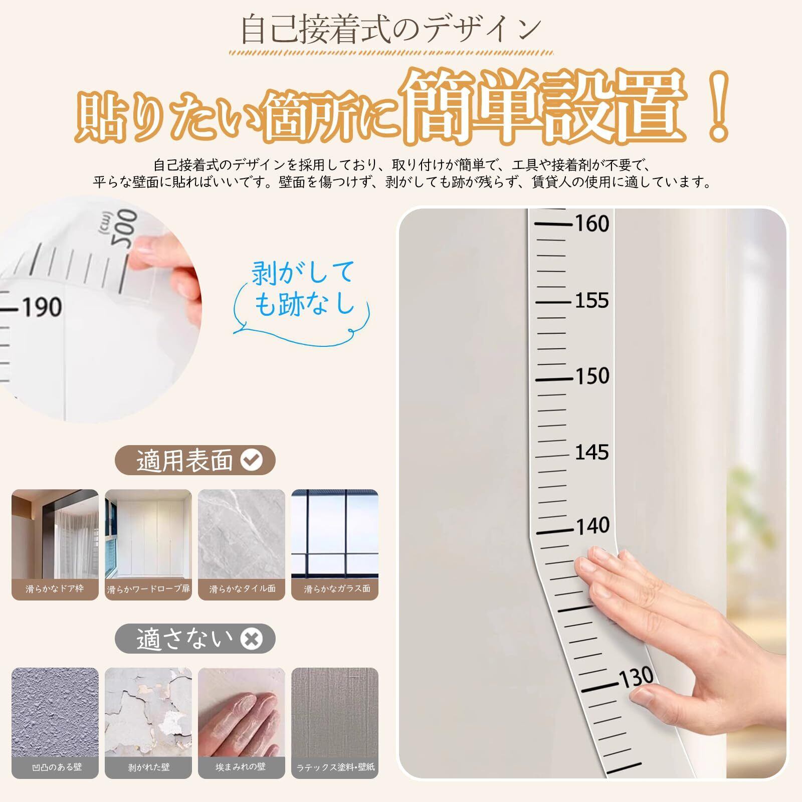 【簡単に取り付け】身長測定ステッカーは自己接着式のデザインを採用しており、取り付けが簡単で、工具や接着剤が不要で、平らな壁面に貼ればいいです。壁面を傷つけず、剥がしても跡が残らず、賃貸人の使用に適しています。注意:凹凸のある表面、湿気やほこりの多い表面、レンガなどに使用しないでください。