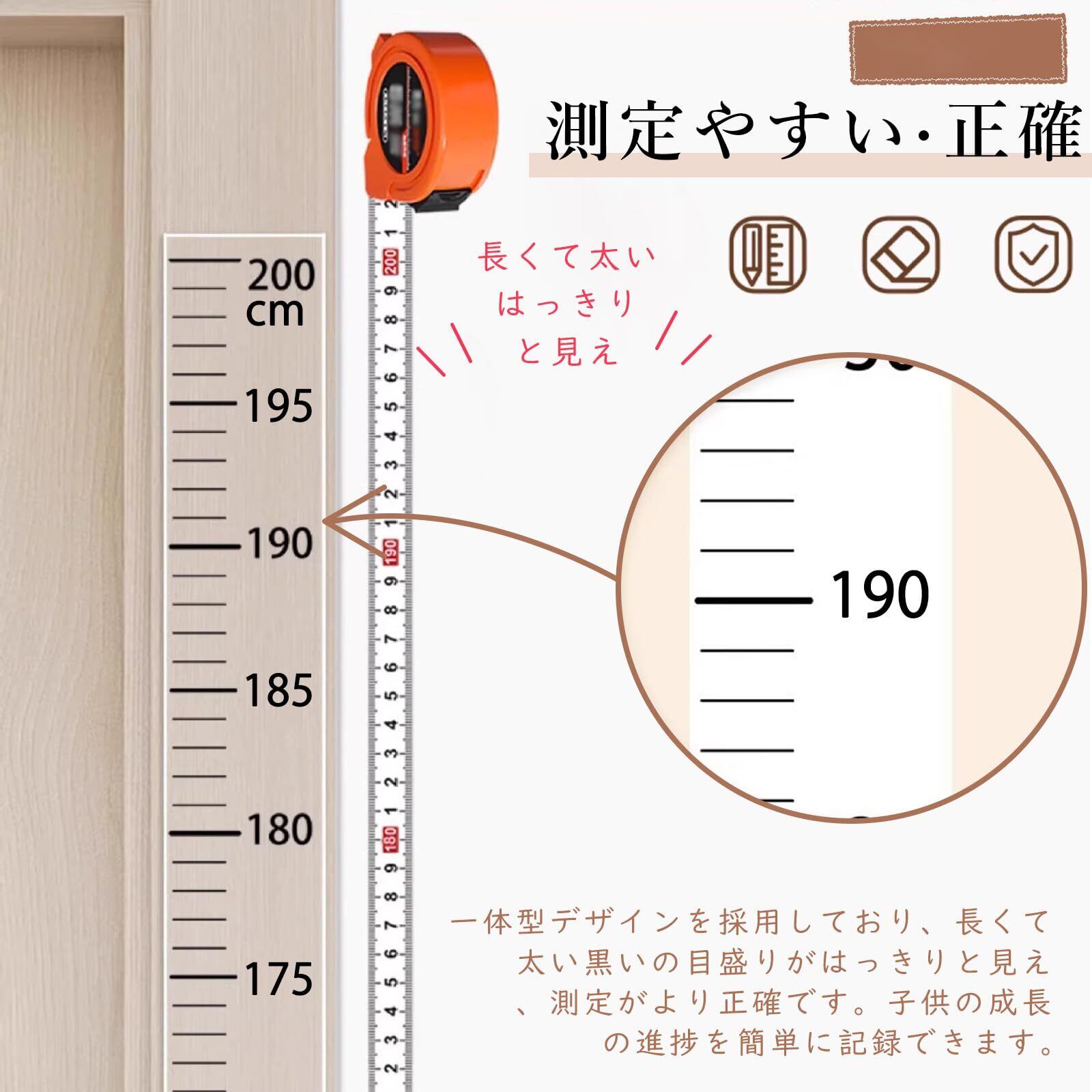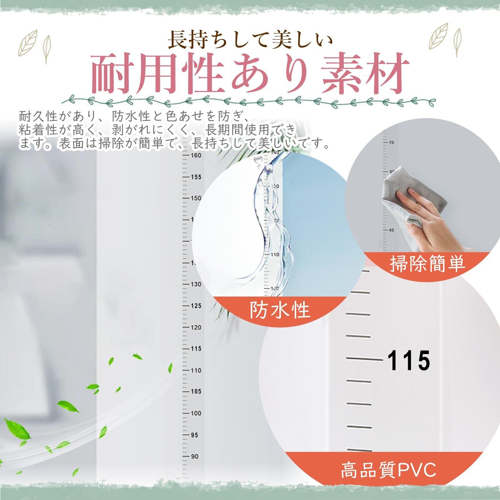 【耐用性あり素材】身長計は高品質のPVC素材を採用しており、安全で耐久性があり、防水性と色あせを防ぎ、粘着性が高く、剥がれにくく、長期間使用できます。表面は掃除が簡単で、長持ちして美しいです。