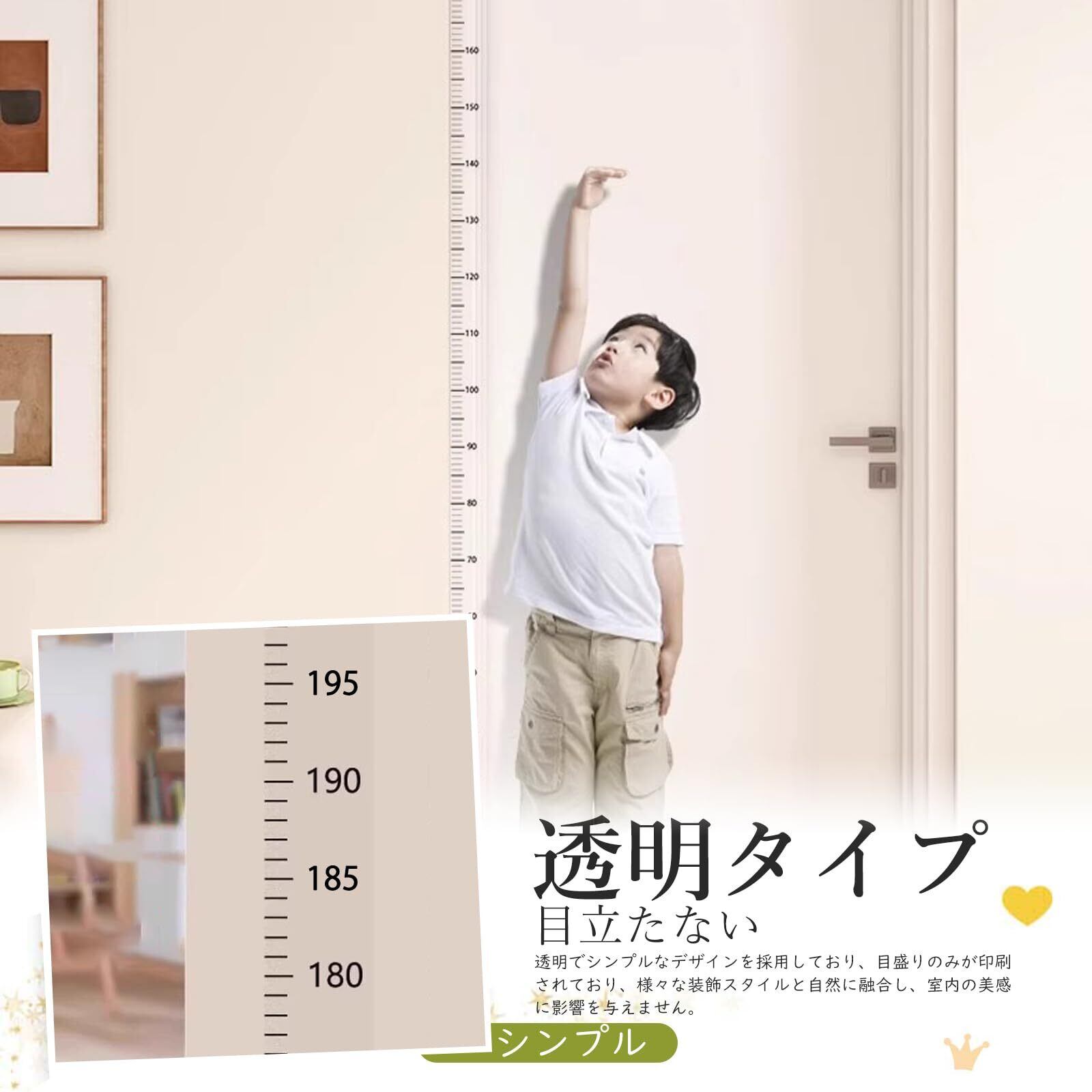 【透明タイプ、目立たない】身長計 ウォールステッカーは透明でシンプルなデザインを採用しており、目盛りのみが印刷されており、様々な装飾スタイルと自然に融合し、室内の美感に影響を与えません。測定範囲は0-200センチで、子供の成長を記録するのに適しており、部屋に実用性と美感を加えることもできます。