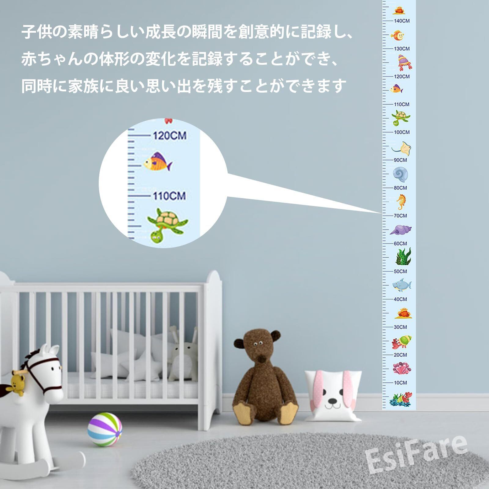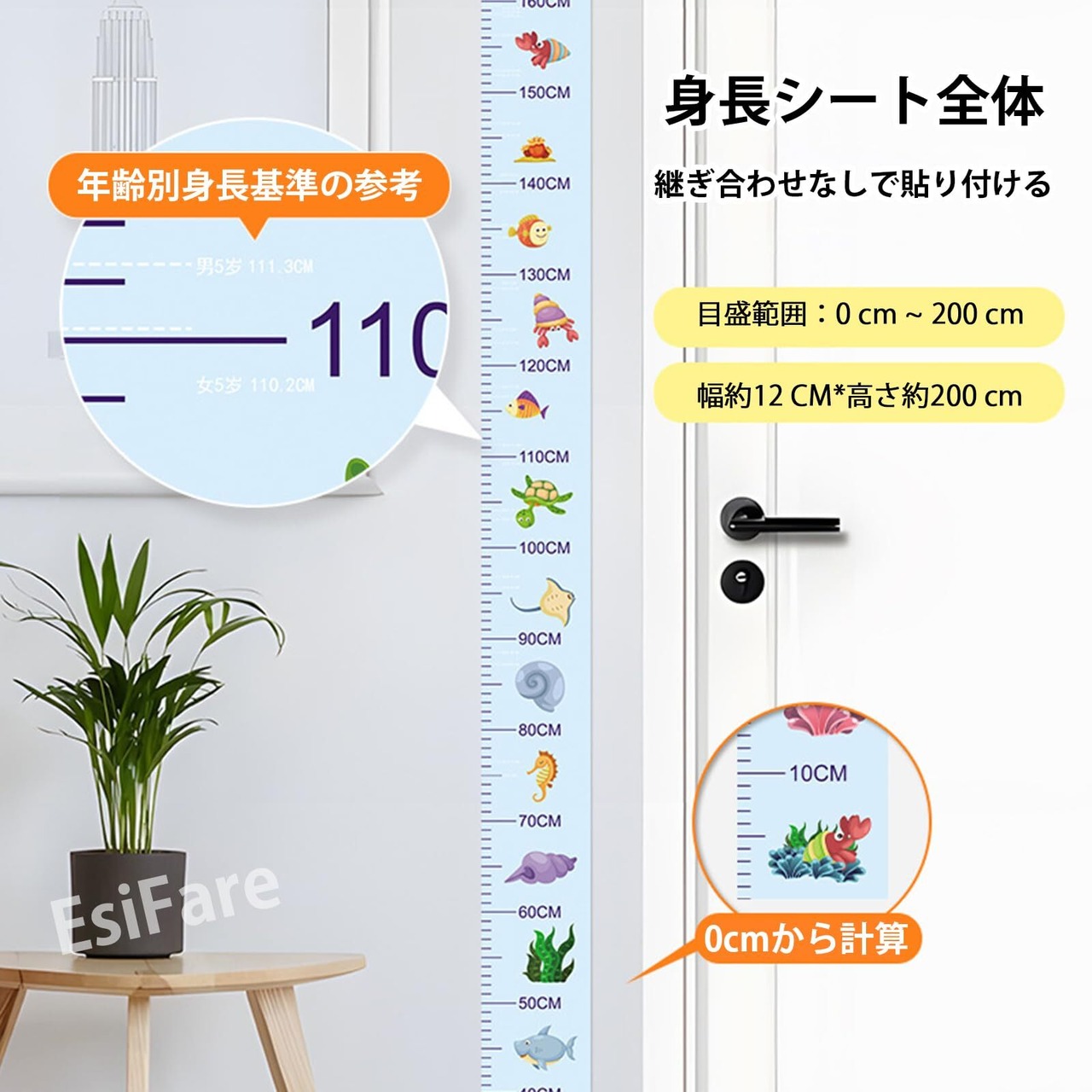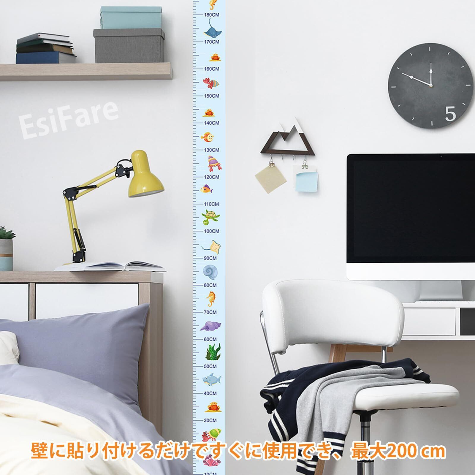 EsiFare 身長計 壁貼り 子供身長計 壁掛け 測定範囲0-200cm 子供の成長記録 一体型 ステッカー 身長計 ウォールステッカー 精度高い こども 身長測定 ステッカー 取り付け簡単 目立たない こども部屋 リビング インテリア 目盛り 出産祝い プレゼント 貼ってはがせる はっきりした目盛り 可愛い (海洋)