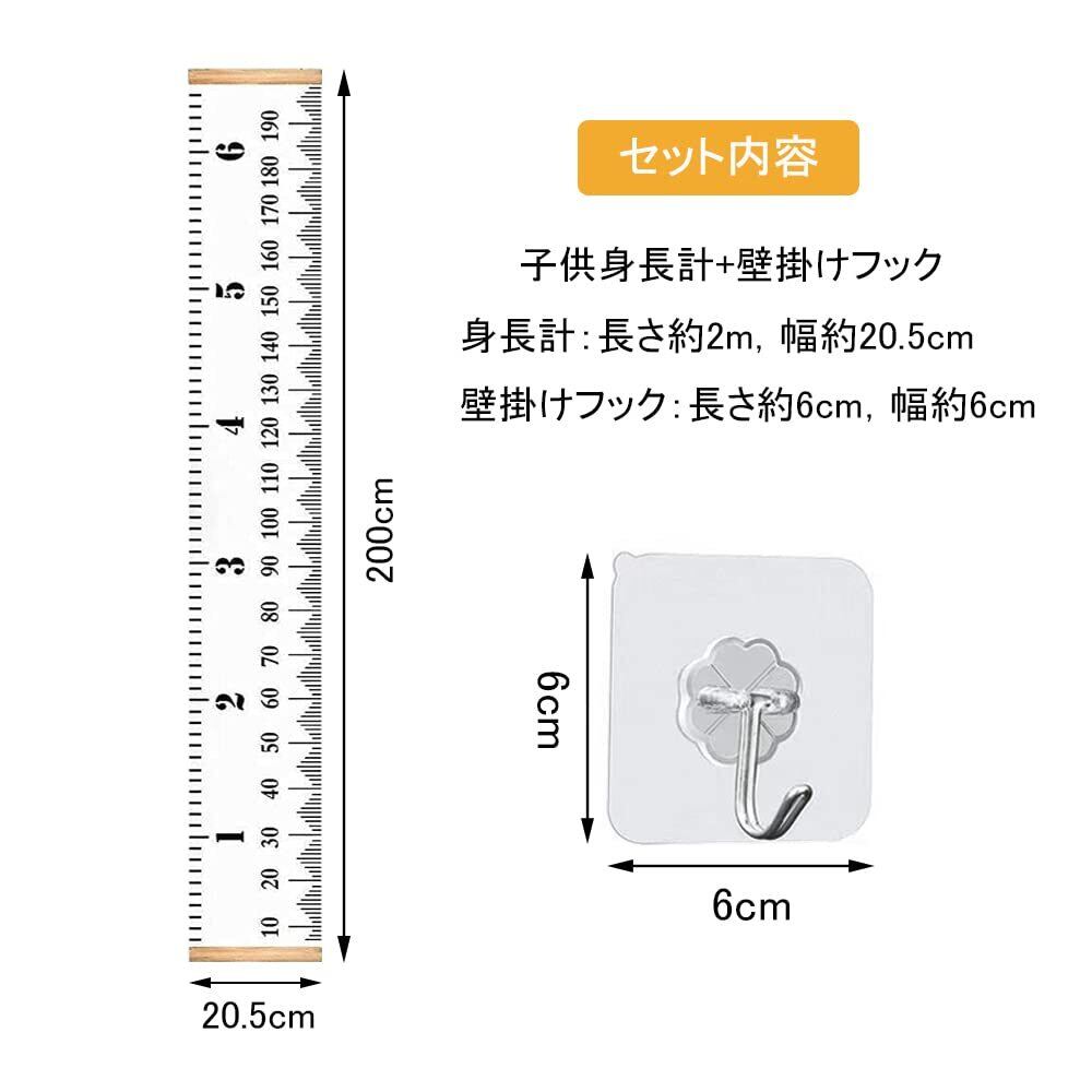 セット内容:子供身長計+壁掛けフック,身長計:長さ約2m,幅約20.5cm,壁掛けフック:長さ約6cm,幅約6cm。