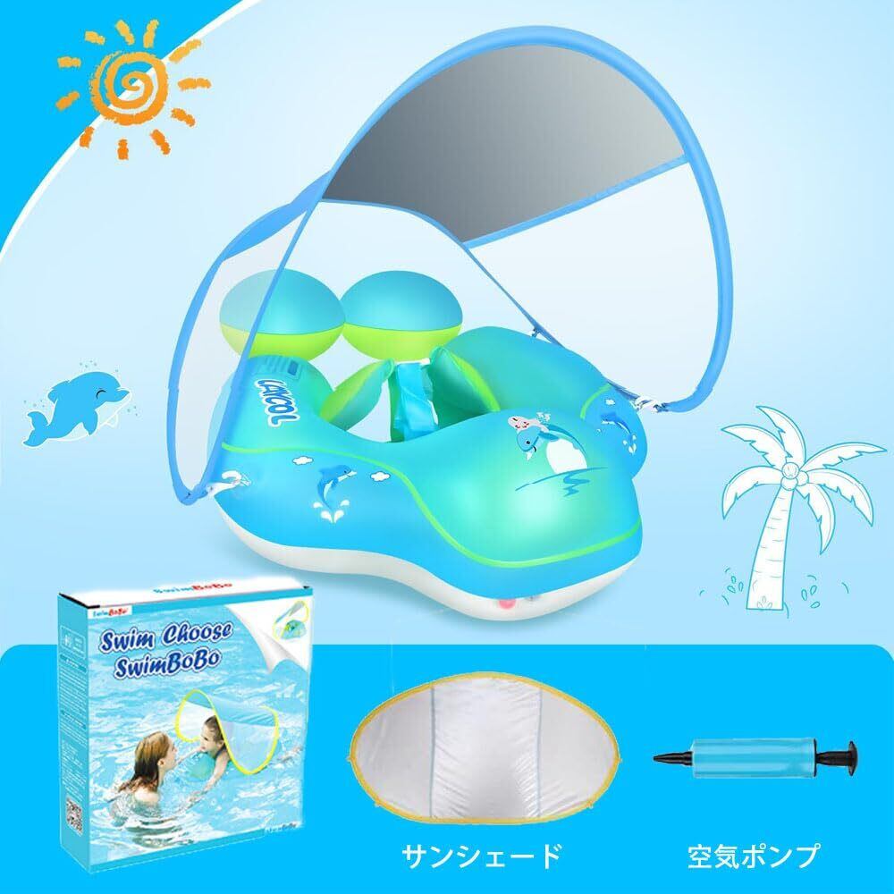 【UPF50+日焼け止め】サンシェードが付属しています。幼児が室外で泳ぐ際にも、彼らの肌をやさしく保護します。また、ハンドポンプも付属して、簡単かつ迅速に泳圈を膨らませることができます。このポンプを使用することで、親の方々も運動不足解消に役立てます。
