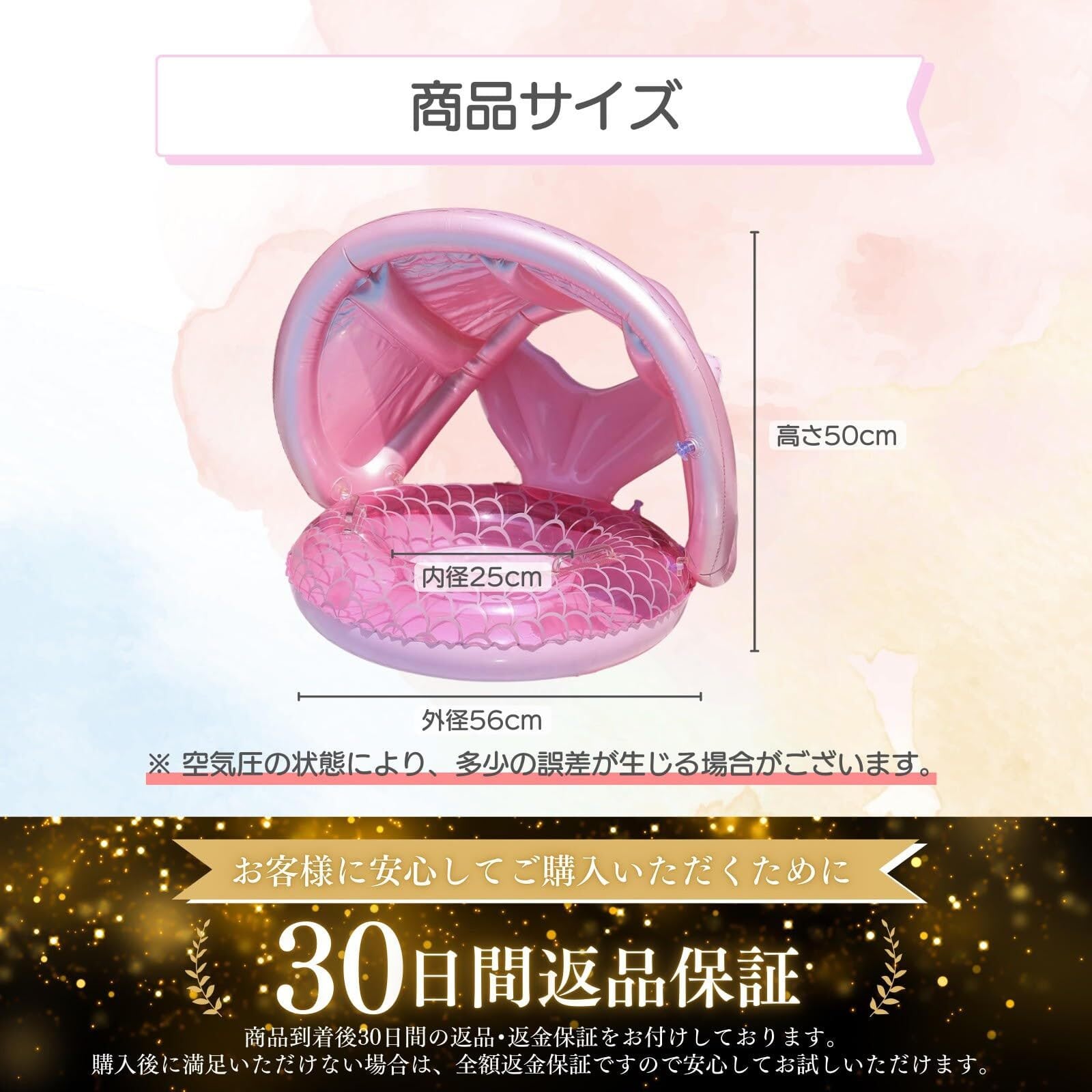 【商品仕様】外径:56cm,内径:25cm,高さ:50cm(ルーフ使用時) 空気は入れすぎないようにして下さい!(膨張の80%-90%で十分です)。注意:赤ちゃんの水泳リングは命を救う製品ではありません。保護者の付き添いが必要ですので、絶対に赤ちゃんは一人で泳がせないでください。