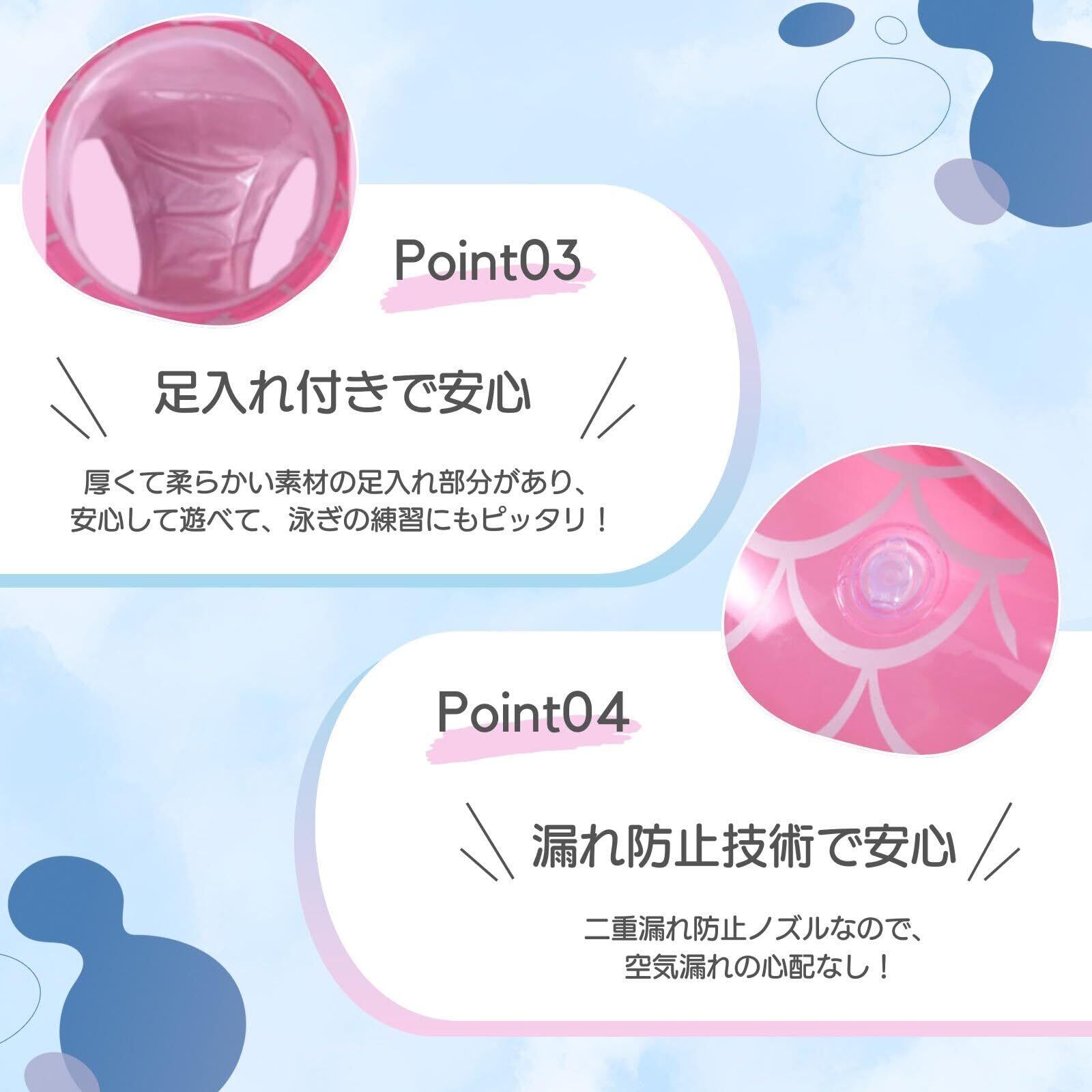 【足入れ付で安心】足入れ部分は柔らかくて厚い素材で出来たベビーフロート(ガード)がついています。お尻のサポートが赤ちゃんや子供の滑り落ちを防ぎます。足入れ型浮き輪は安定性が高く年齢の小さい子供に適しており、泳ぎの練習にもピッタリです。