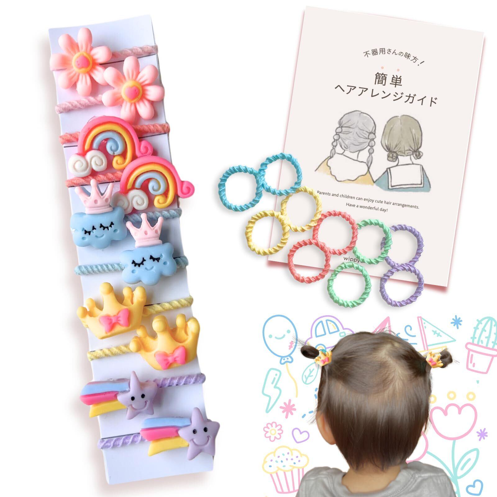 【新春セール】wippyperro 【髪の少ない子供専用】 飾りつき ヘアアレンジ ガイド付 ベビー ヘアゴム 子供 髪ゴム 赤ちゃん キッズ 可愛い 痛くない 絡まない 保育園 薄毛 (お空セット)