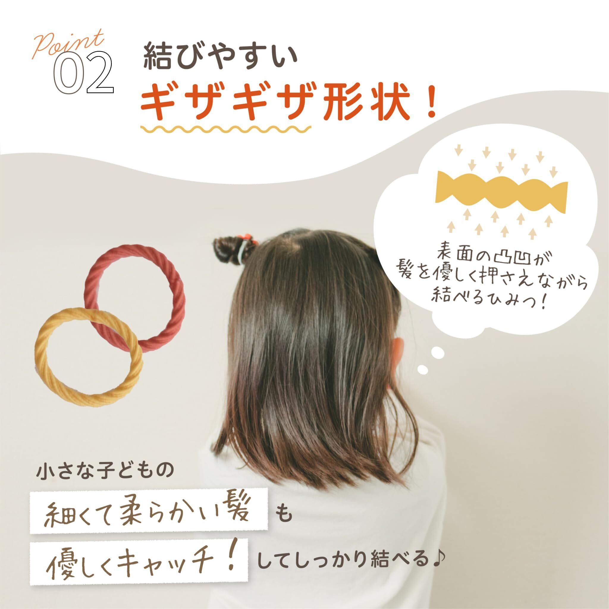 【髪の毛の少ない子供専用ヘアゴム】独自のギザギザで髪が少なくても結びやすい! ゴムが小さめで伸縮性があり、細く少ない髪でもしっかりホールド。結びやすくほどけにくいので、元気に遊んでも崩れにくい!