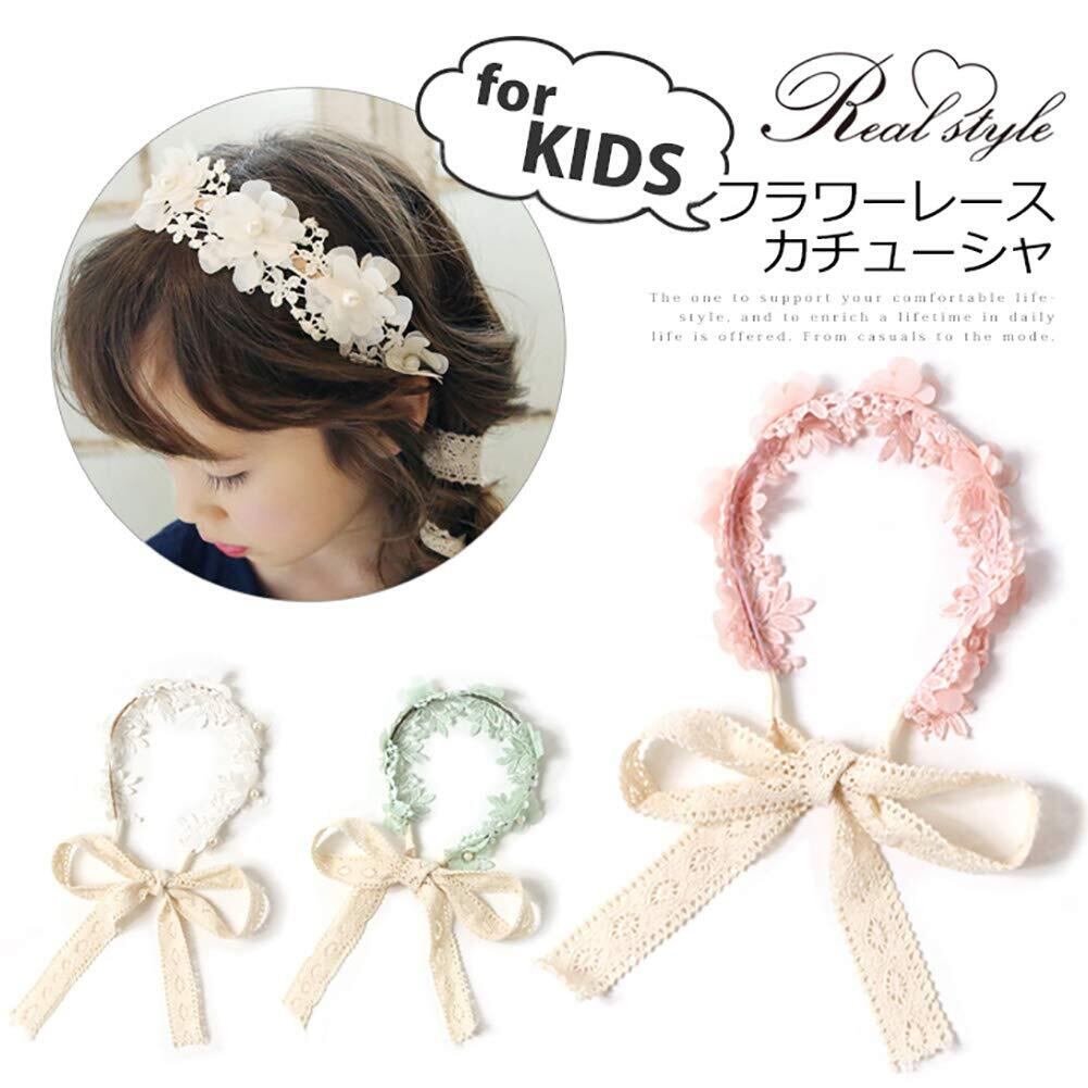お花のモチーフと細かな刺繍がついたキッズカチューシャです。 長めのレースがついているので、ヘアアレンジにもぴったりです
