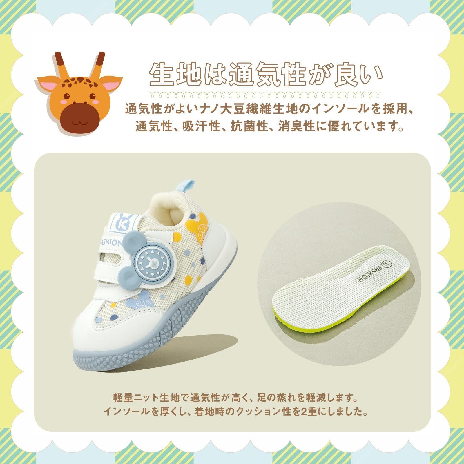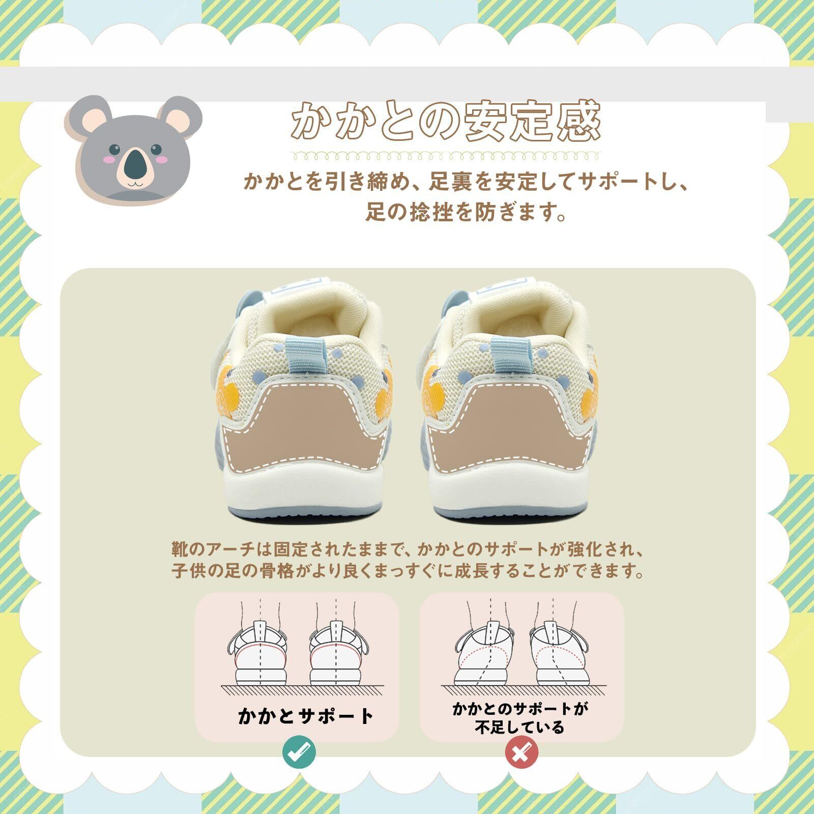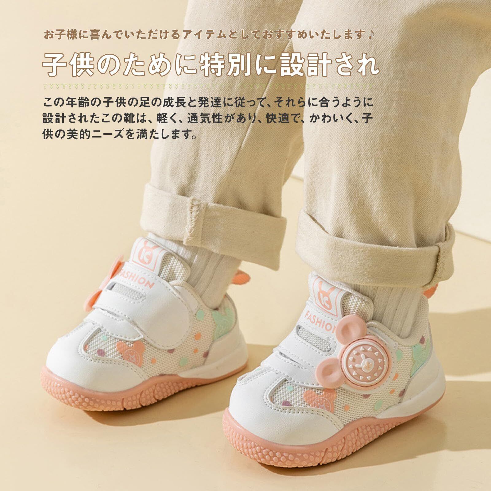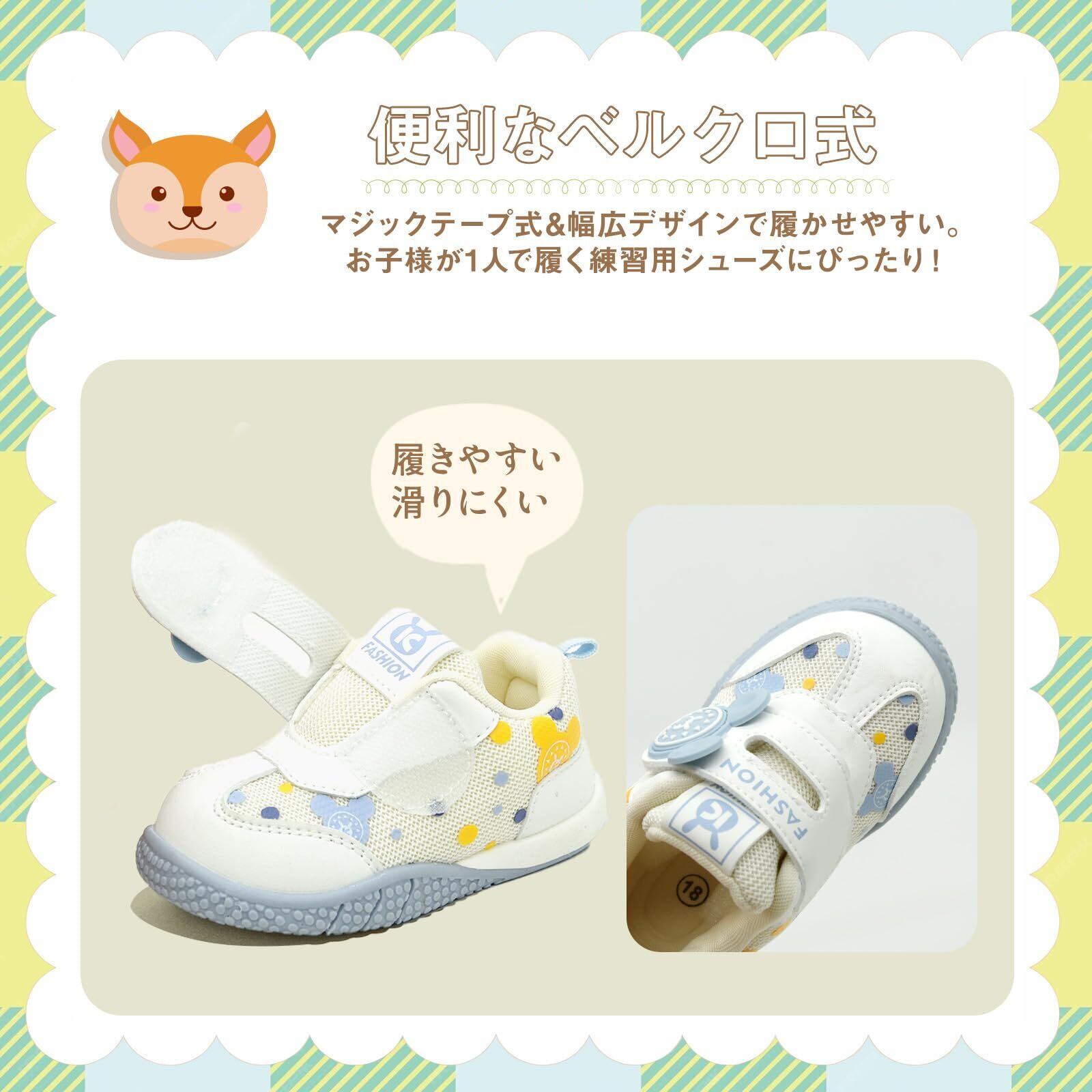 【サイズ選択の推奨】ザイズ選択:サイズ=足長+0.5~1.0cm=靴内長。お子様の実際の足のサイズにを基準にお選びください。ママパパが選ぶ赤ちゃん期のシューズの条件をクリア!「履かせやすく、自分で履く練習にもなるマジックテープタイプ」「靴が柔らかく、曲がりやすい」「つま先の部分は広さがある」「かかとの周りがしっかりしている」「オールシーズン履かせやすいデザイン」これらを叶えたベビーシューズです!