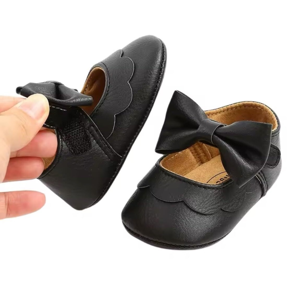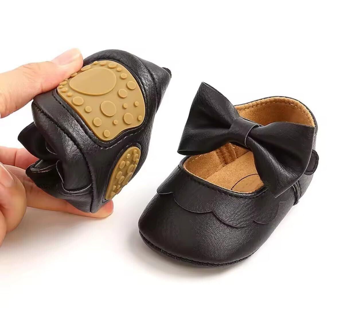 赤ちゃんの足を可愛らしく飾るベビーシューズです。リボンとスカラップの装飾が愛らしい雰囲気を醸し出しています。柔らかい素材で赤ちゃんの足に優しくフィットし、歩行の練習にも適しています。レッド、ブラック、ホワイト、ゴールドなど、様々な色展開から選べます。ファーストシューズとしてはもちろん、お祝いの席やお出かけ時の装いにもぴったりの一足です。手洗いをおすすめしますが、お手入れが簡単です。