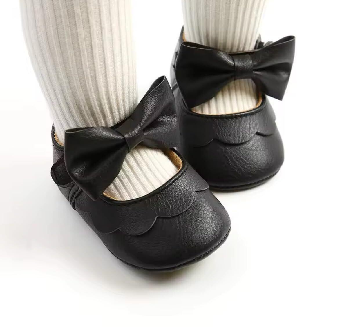 かわいいデザイン: 赤ちゃんの足に可愛らしいリボンとスカラップの飾りが付いた、愛らしいベビーシューズです。