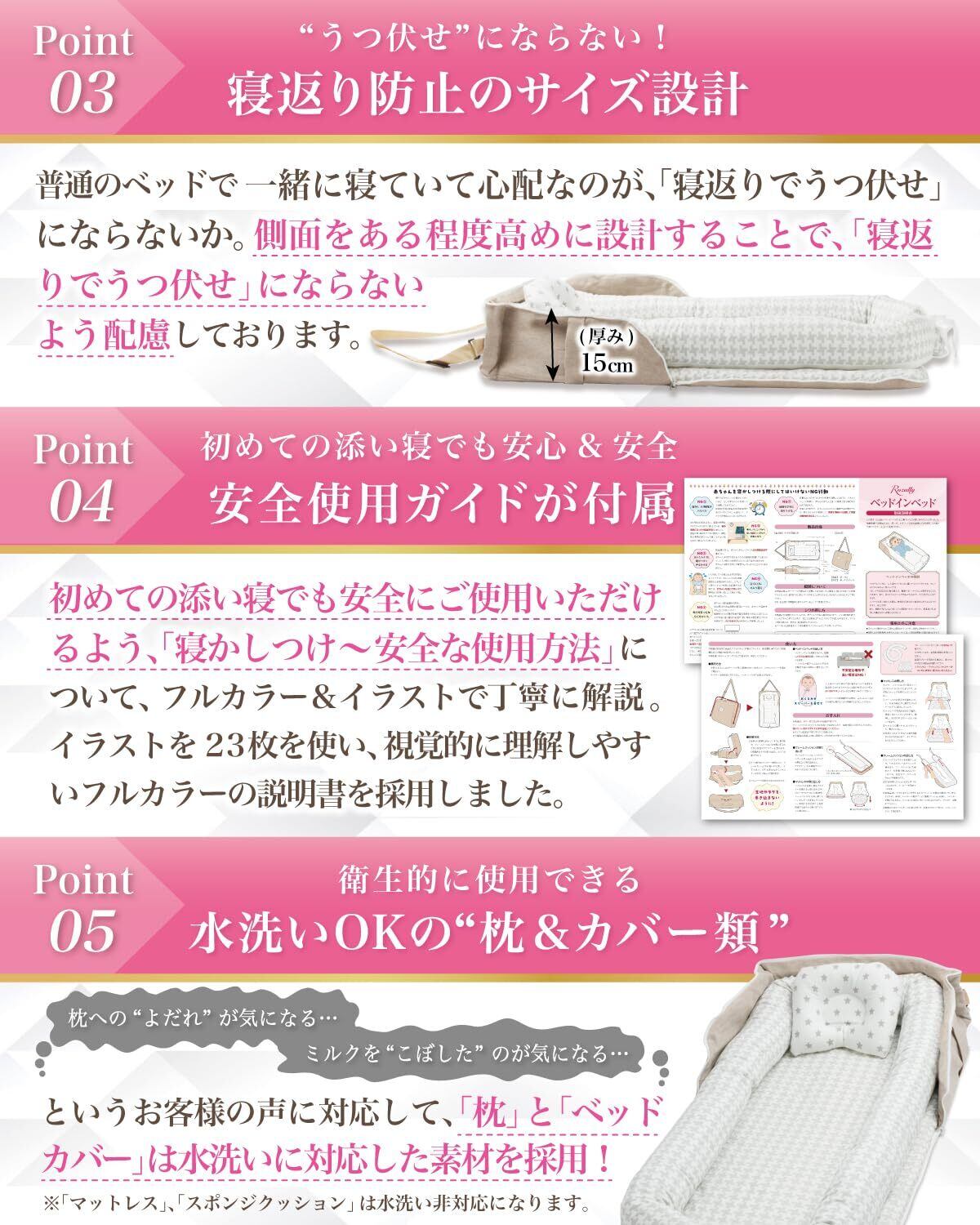 【フルカラー説明書が付属!】 本製品には手軽に赤ちゃんと添い寝できるよう、商品の収納方法 はもちろん 衛生的に使える洗濯方法 など丁寧に使用方法を解説させて頂きました。女性のお客様1人でも使い始められるよう、イラスト23枚で徹底解説しています。