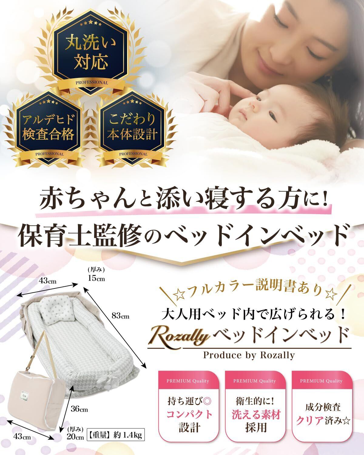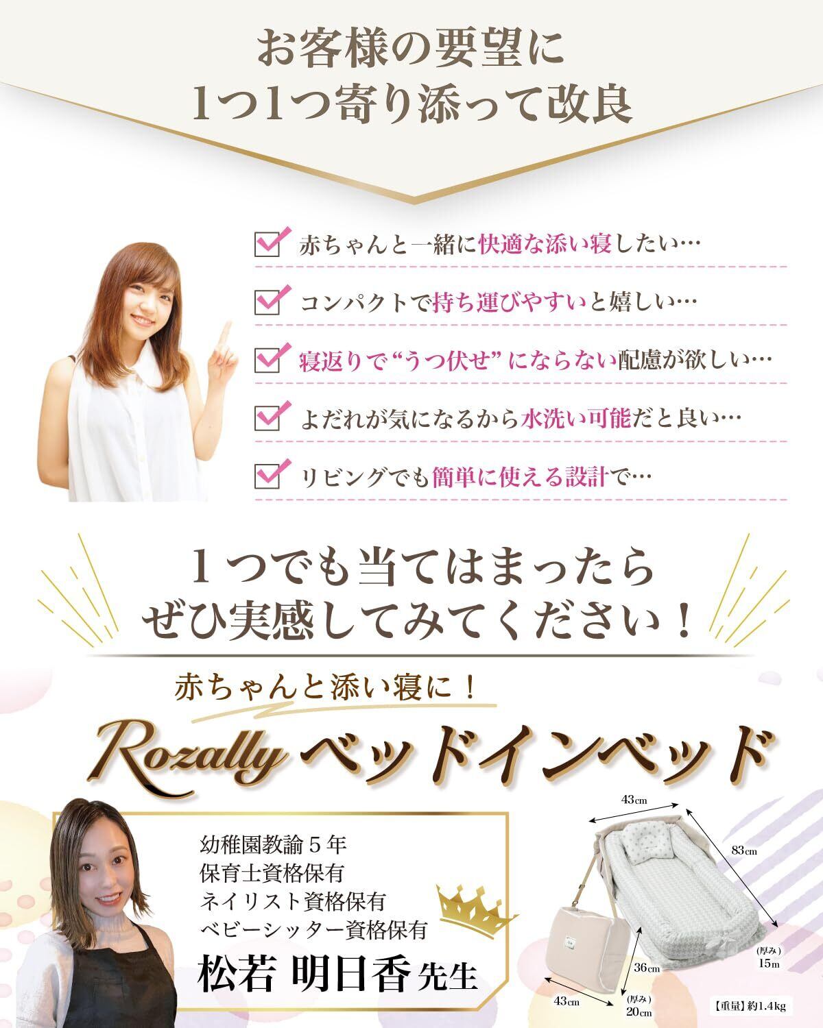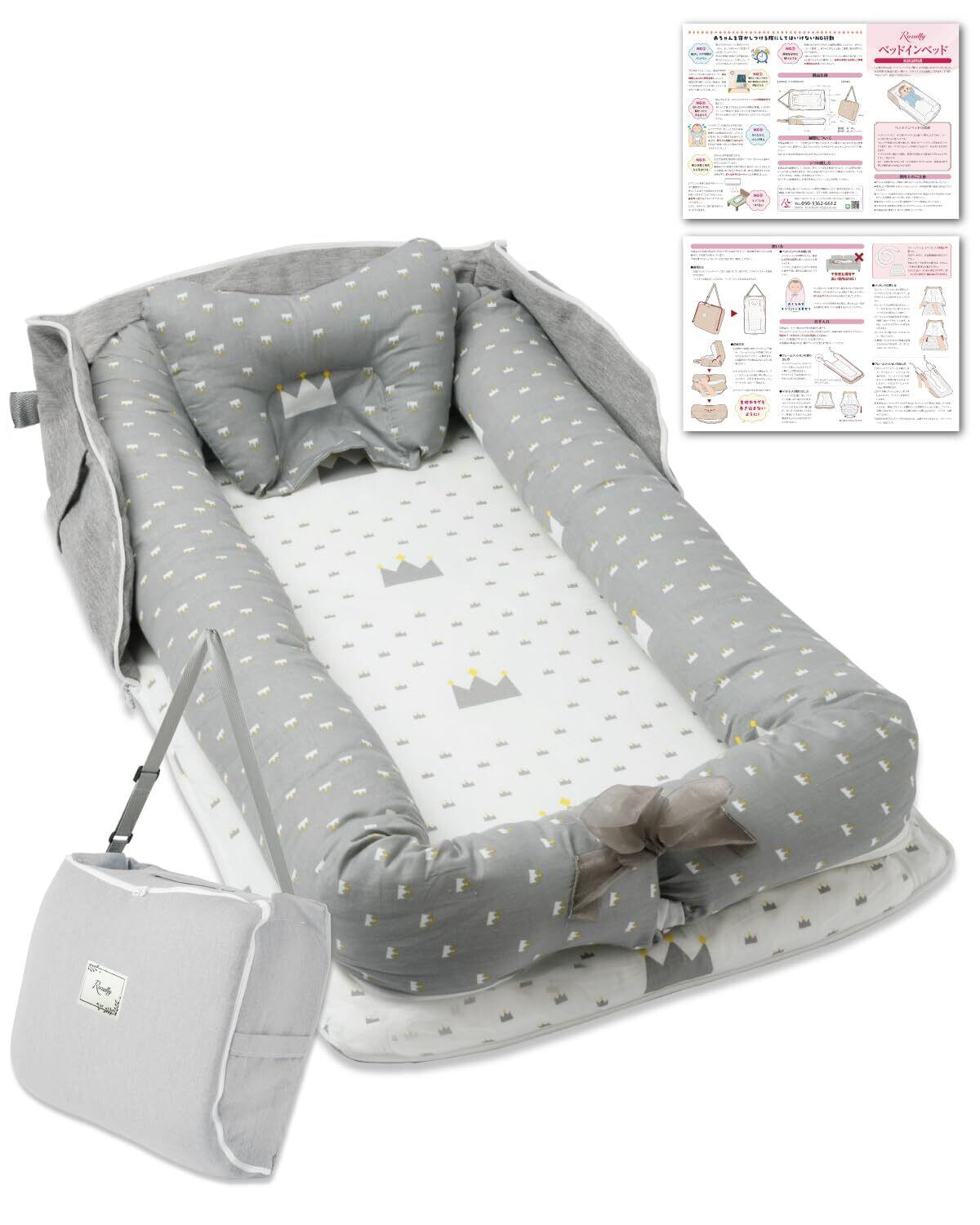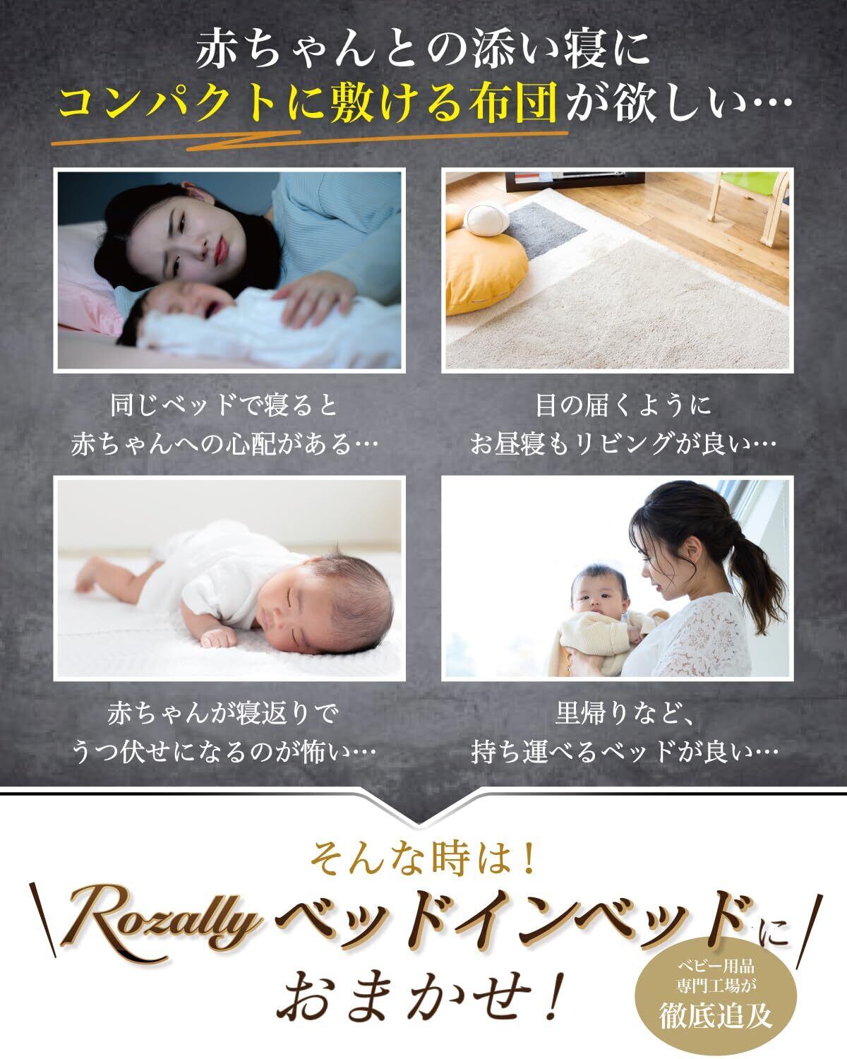 【保育士が監修】 Rozally ベッドインベッド がついに正式販売開始。 赤ちゃん と 添い寝 をする時に 寝返り防止 機能がある ベッドインベッド が欲しい…というお客様の声から生まれた 持ち運び 可能なベットインベットです。 乳幼児 がリビングなどママさんの目の届く所で寝れるように “折りたたみ コンパクト”&”軽量”の 持ち運び設計で企画させて頂きました。 企画&設計では 新生児 や ベビー の育児に詳しい【保育士】の先生からアドバイスをもらい、 折り畳み 方法 や 転落防止 など色々な使用方法を説明書として添えて企画&開発しました。衛生面にも配慮して、通気性 がよく 洗濯可能 なモデルになっています。