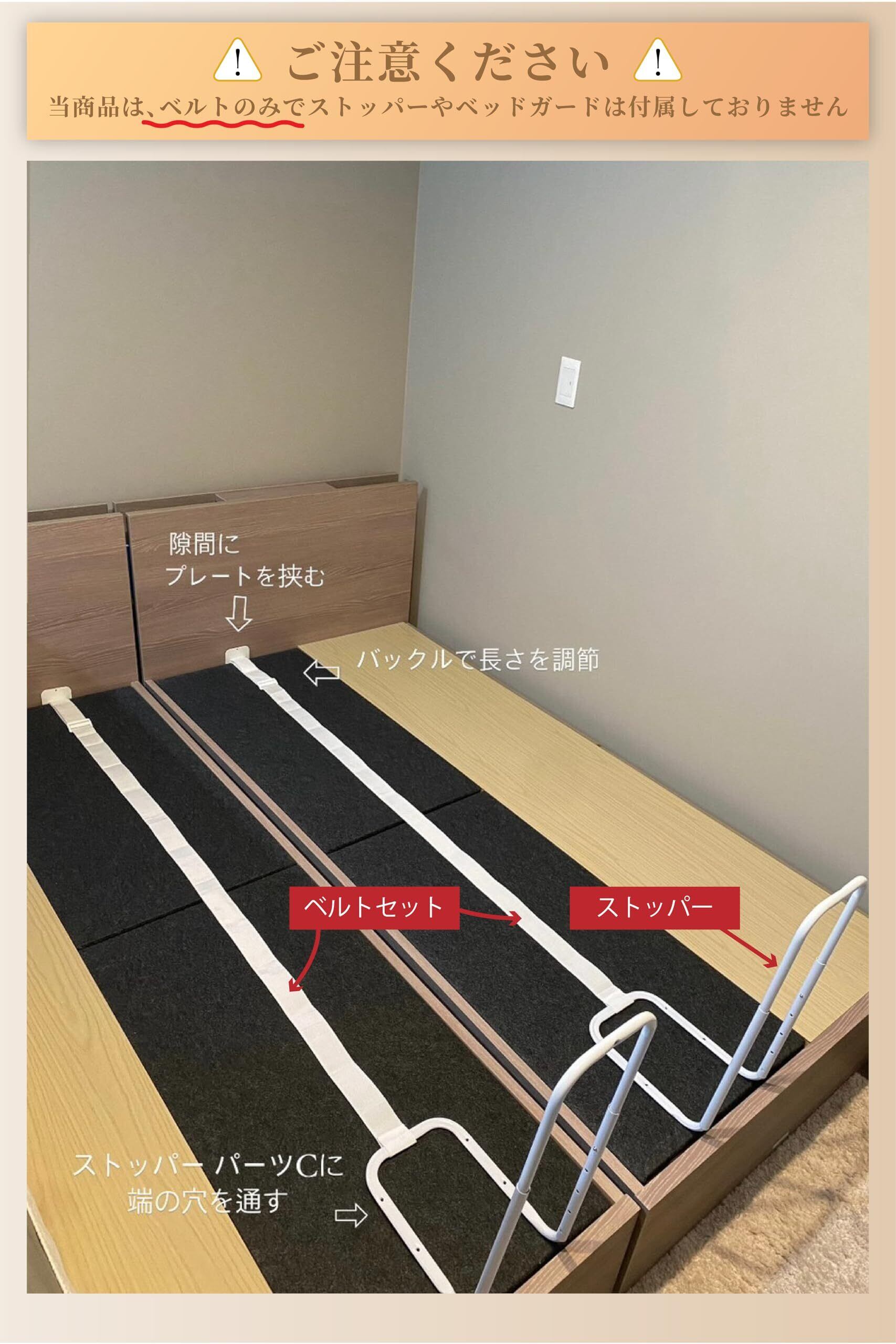 【子育てママ達の声を商品に反映しました】大人気ベッドガードの付属品として、金具ストッパーがネジ留めできないベッドの方、ネジ留めしたくない方に向けて、固定ベルトを開発いたしました。2mと1.8mのベッドガードを お買い求めの方はベルト4個セットを、1.5mの方はベルト3個セットをお使いくださいませ。