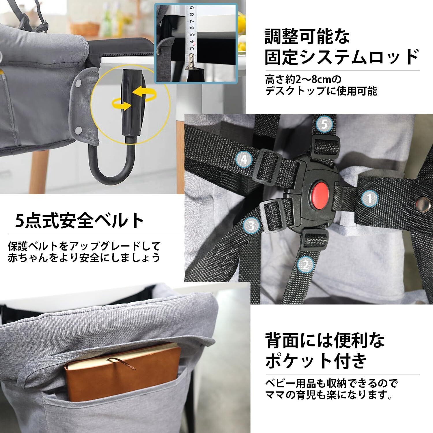 【多用途】トレー付き 折りたたみ可能、収納袋付きなので、レストランやカフェでの外食、ママ会、公園ピクニック、外食、旅行や帰省、毎日の家族の食事など様々なシーンで活躍します。(座面下のベルクロを開けると、ベルクロポケットの中に収納ポケットがあります。)
