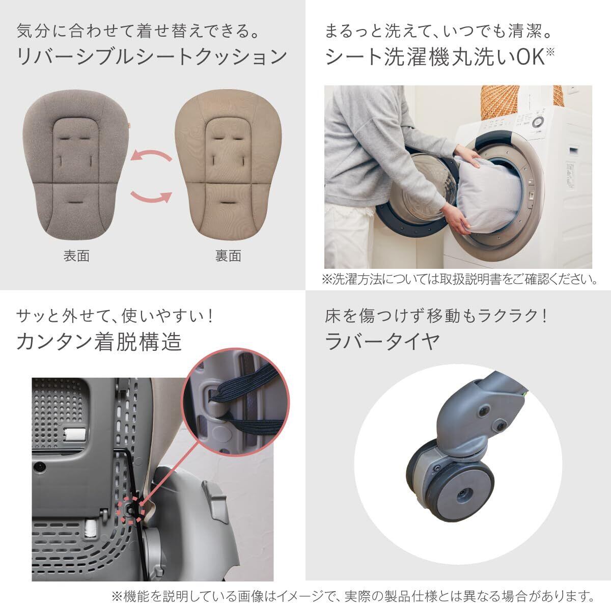 ●ロングユース:寝かしつけのベッドからお食事のときのハイチェアまで。赤ちゃんの成長に合わせて幅広いシーンで活躍します。