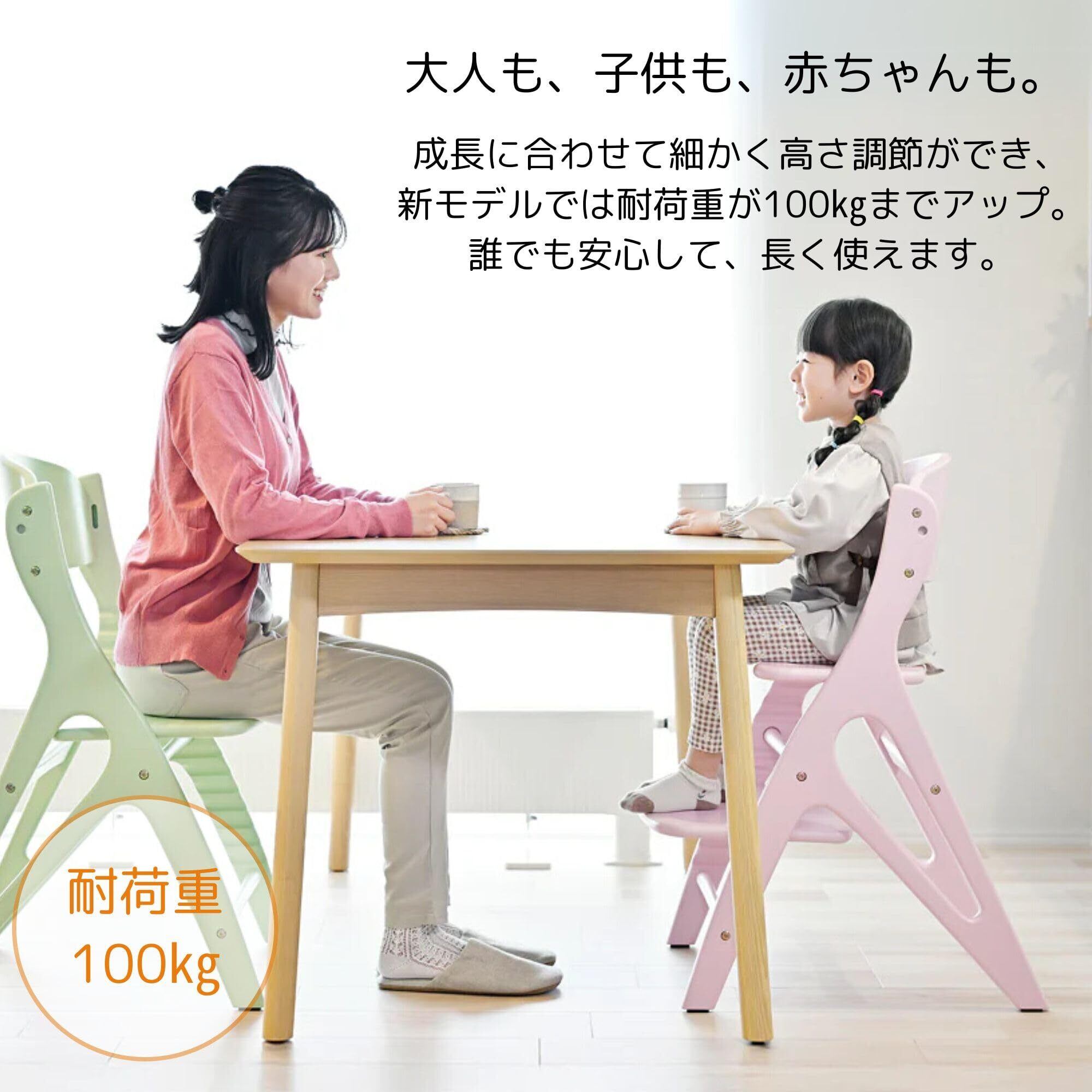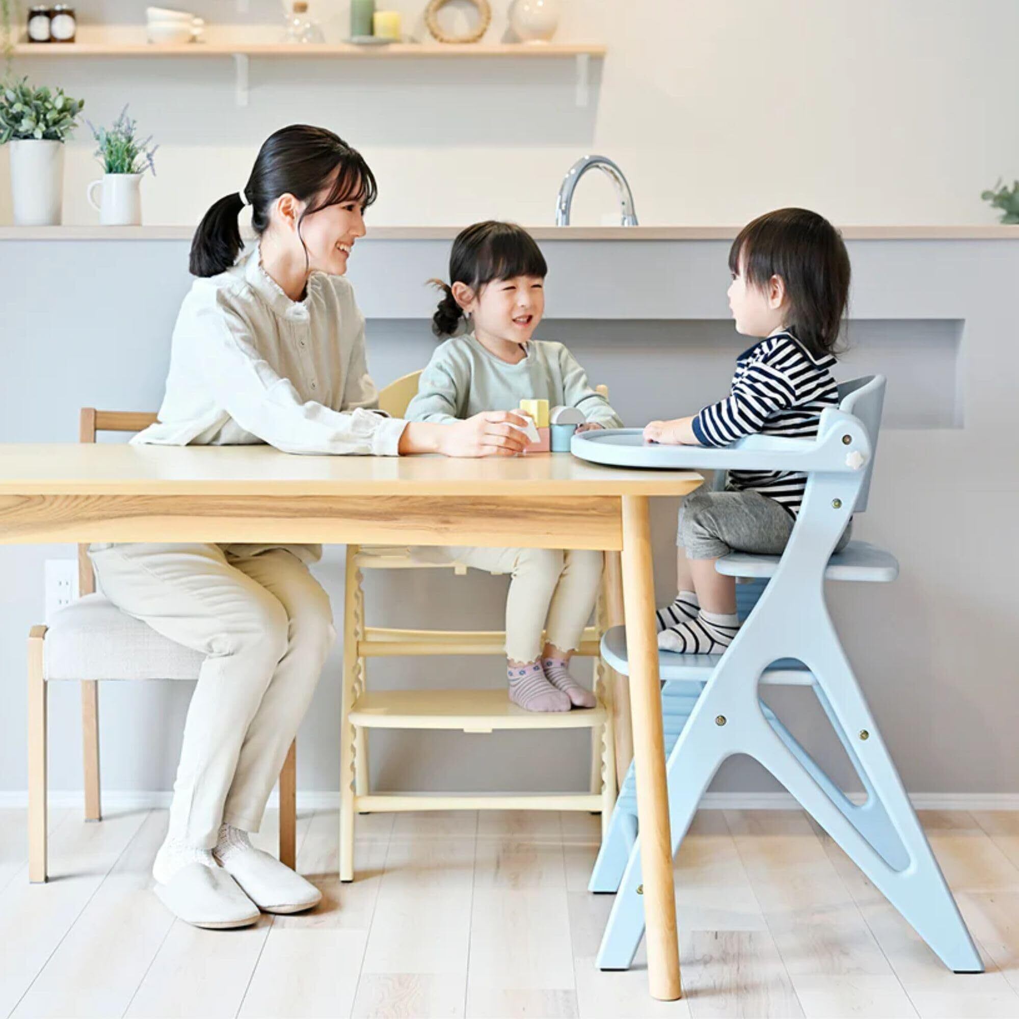 穏やかなカラーリングでありながら、お子様も楽しみやすいよう、その色らしい色味を追求しました。 みずいろ、むらさき、ピンク。好きな色に囲まれて、親子の会話も弾みます。 成長に合わせて高さ調節できるので、いつも「足が届く」姿勢でお座りができキッズチェア大人も座れるチェアとして長くお使いいただけます。