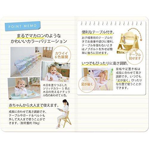 マカロンをイメージしたかわいらしいカラーバリエーションのチェア。 テーブルは使わない時にはノブボルトを外せば簡単に後ろに回せて便利。 成長に合わせて高さ調節できるので、いつも「足が届く」姿勢でお座りができキッズチェア大人も座れるチェアとして長くお使いいただけます。