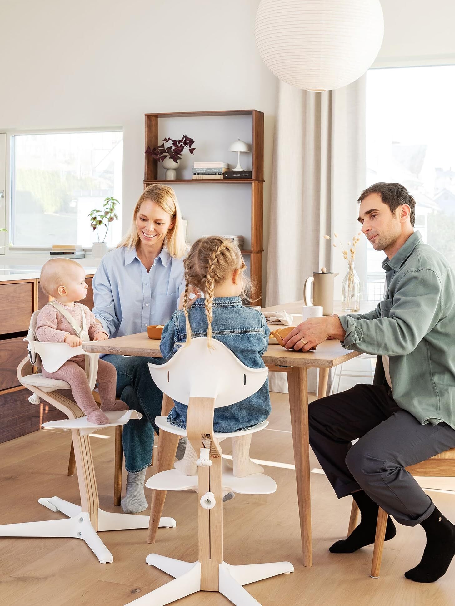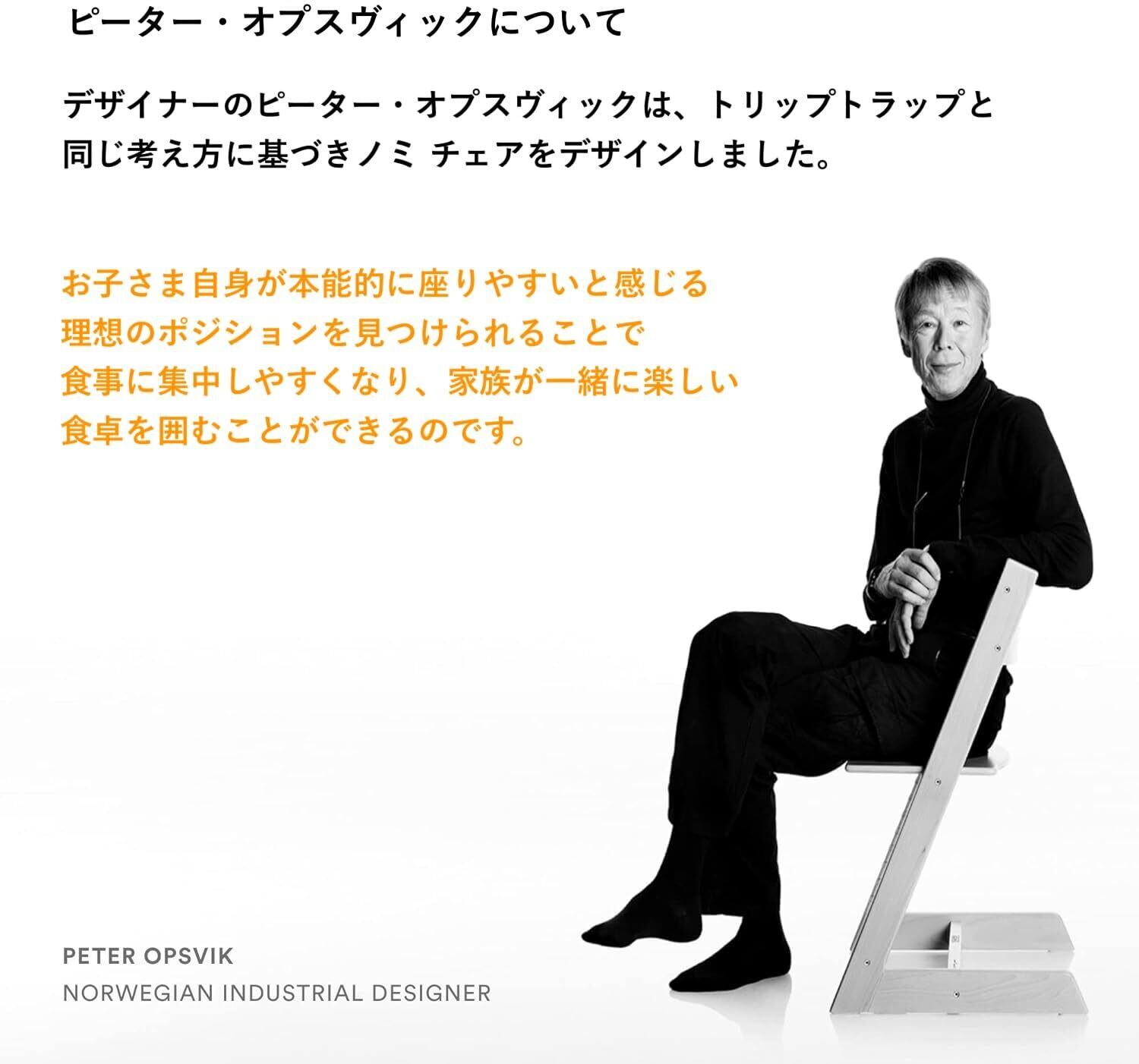 1972年、北欧の著名デザイナー、ピーター・オプスヴィックが、息子トールのためにデザインしたトリップトラップ チェアは、家族で囲む楽しい食卓のために生まれました。その後、孫娘のアイリスのために誕生したのが、アクティブ・シッティングを提唱するノミ チェアです。どちらのチェアも、子どもたちが自由な姿勢で座れるようサポートし、人間工学に基づいた正しい姿勢を見出すよう、自分から積極的に座ることを促します。この”ノミの名前は「Ergonomics エルゴノミック(人間工学)」に由来します。