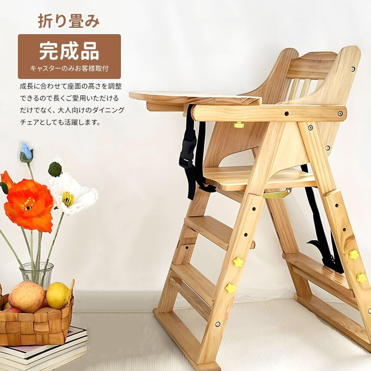 【製品仕様】・本体サイズ:W45*D48*H72~85cm・本体重量:9kg ・使用対象年齢:6ヵ月~ ・素材/材質:松材・ 届いたらすぐに使える完成品。組み立ての手間はありません。