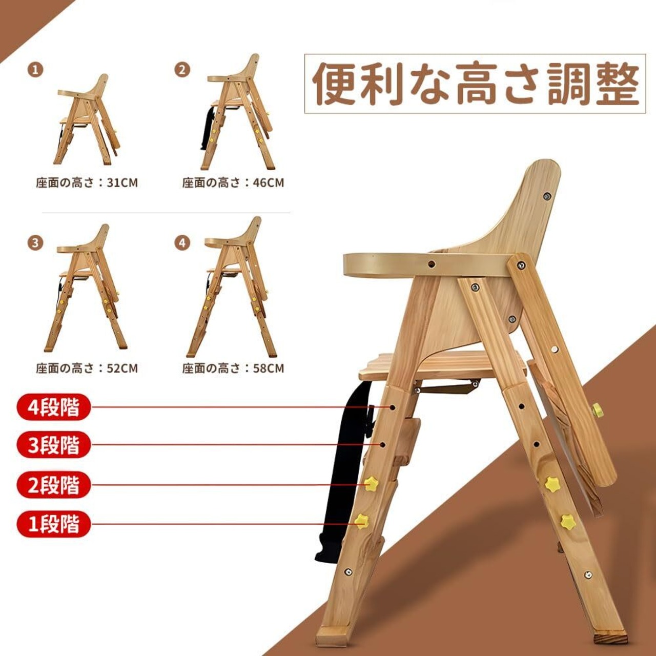 【多機能ハイローチェア・4段階高さ調整】ハイチェアにもローチェアにも変身できる一台多役の機能的ダイニングチェア。また、キャスターを取り付けることができ、移動便利です!赤ちやんから大人までお使いいただけます。