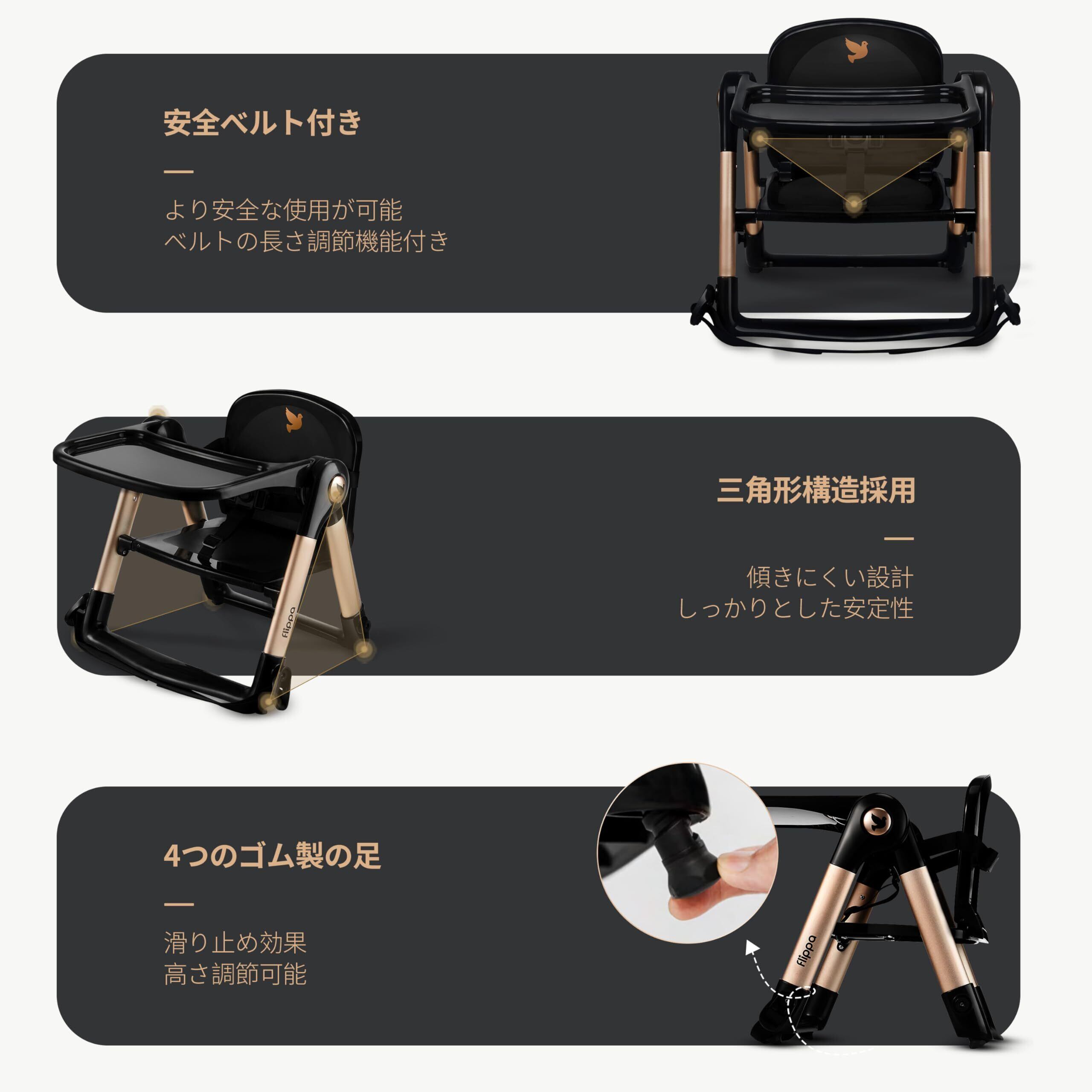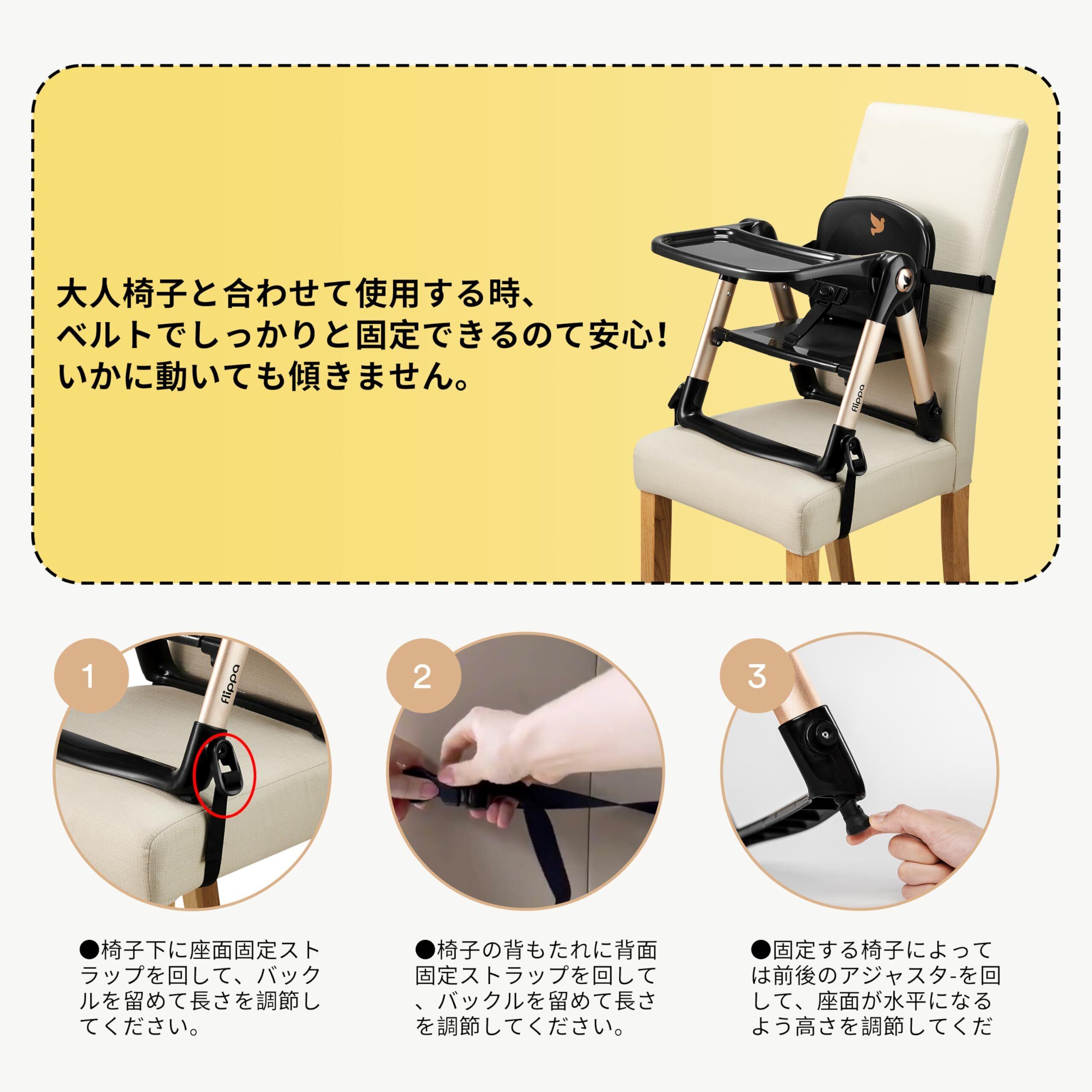【ハイチェアとしても】大人の椅子にしっかりと固定できます!ハイチェアに乗せて、家族揃っての食事時間がより豊かになり、親子の温もりあふれる雰囲気をつくります。専用安全ベルトでハイチェアにしっかりと固定します。安定性抜群なので、転倒の心配がありません。