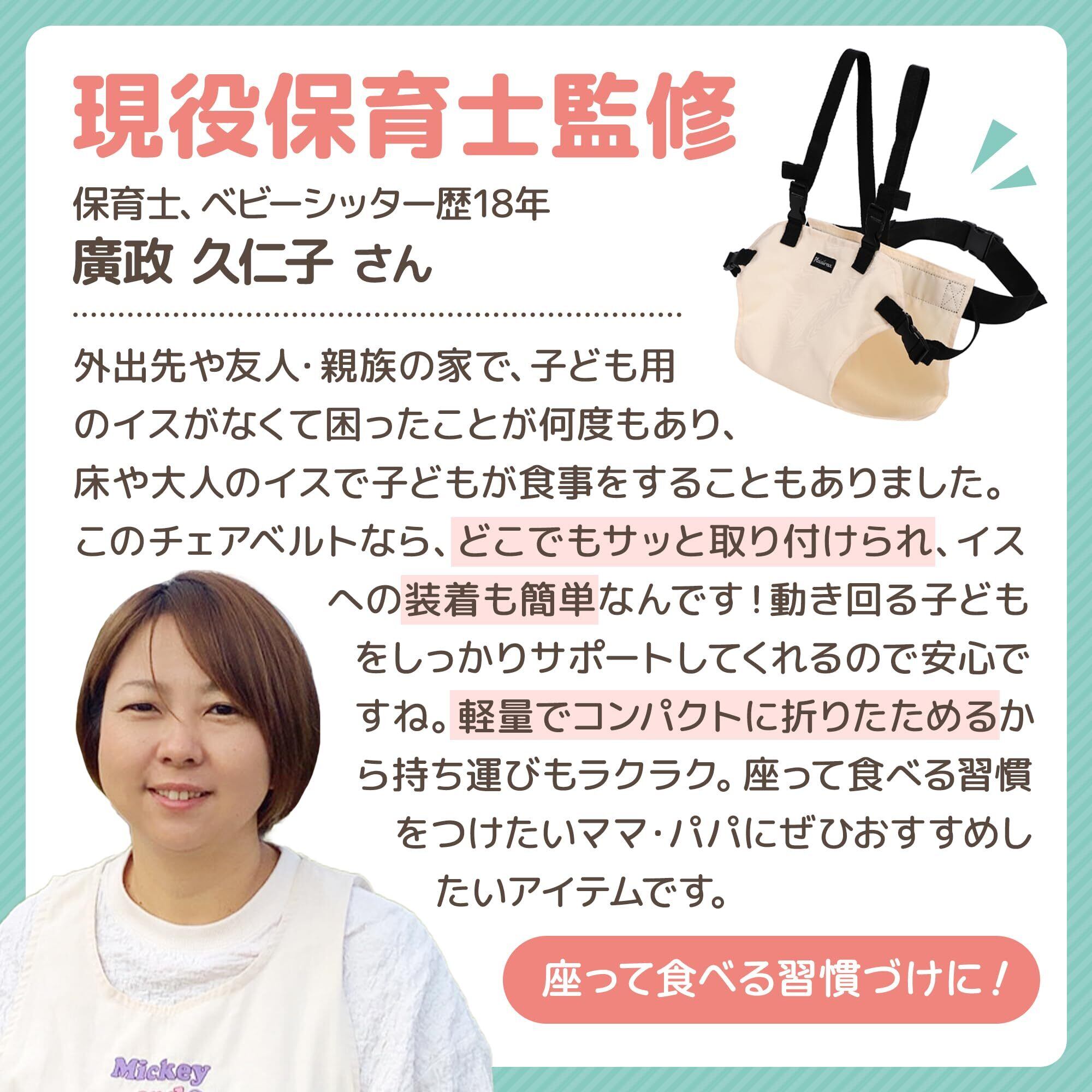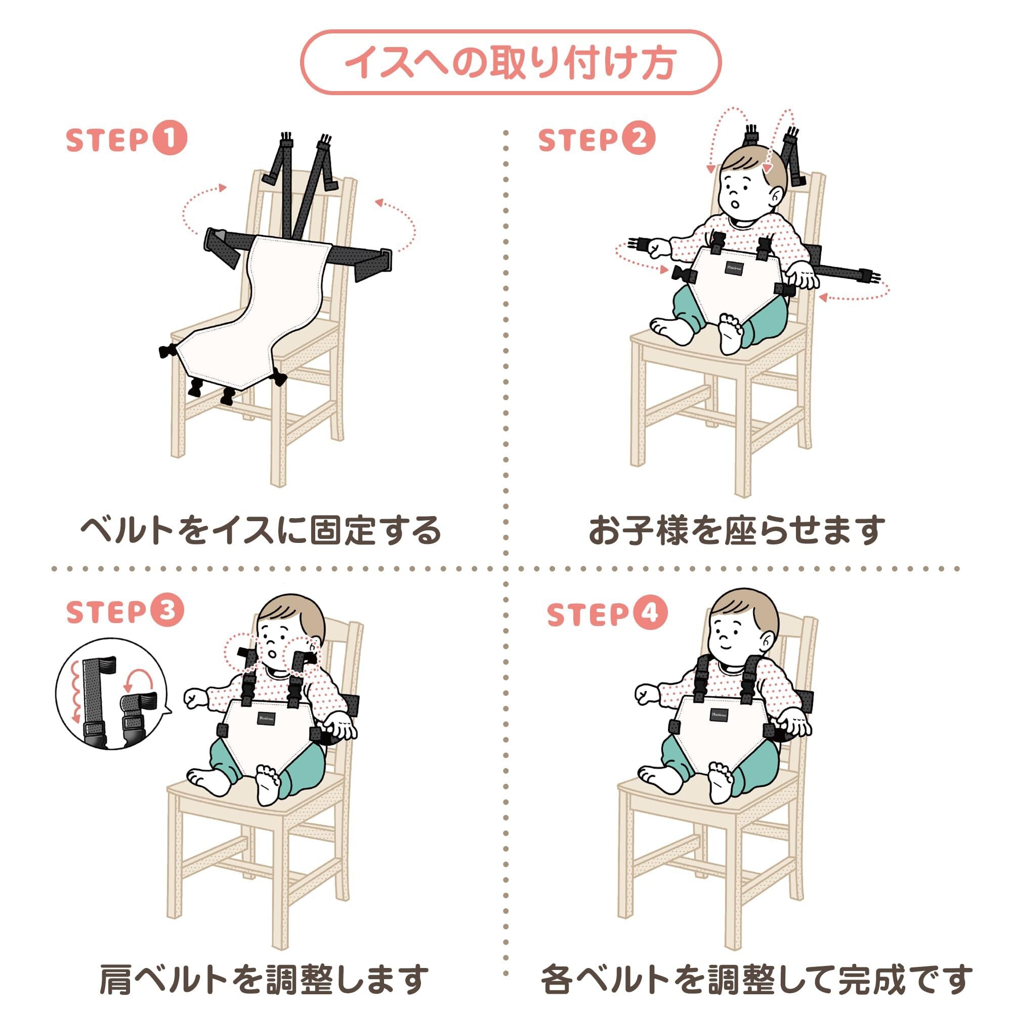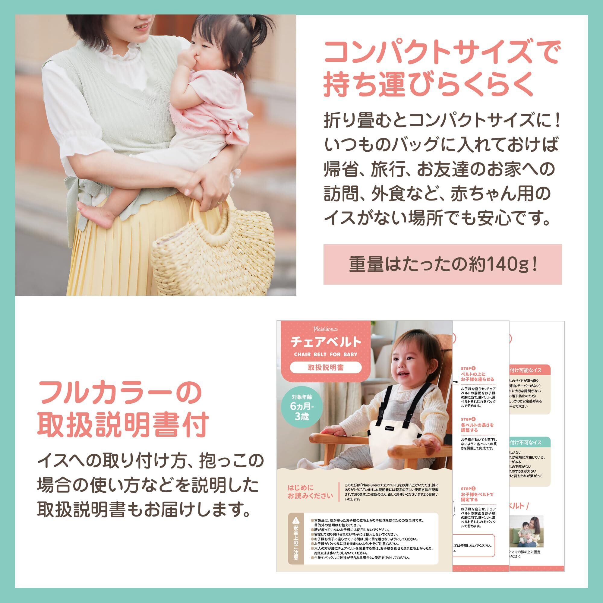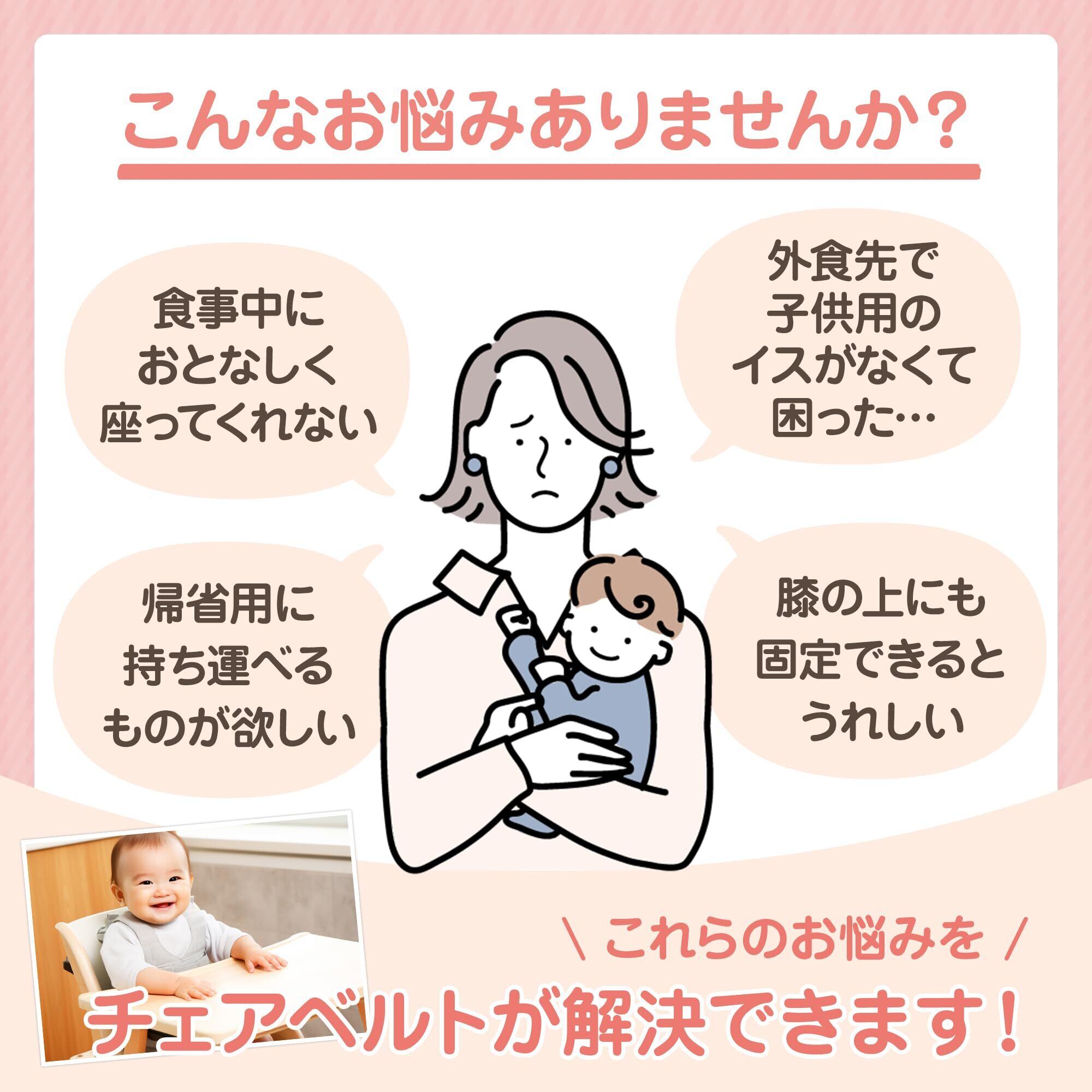 【商品仕様】○対象年齢:6か月~3歳程度(腰が座ったお子さま対象) ○サイズ:胸囲40~80cm対応 ○カラー:ブラック、ネイビー、グリーン、クリームベージュ ○セット内容:チェアベルト、説明書 ○洗濯:洗濯機で洗う場合はネットに入れて「弱」での洗濯をおすすめします。