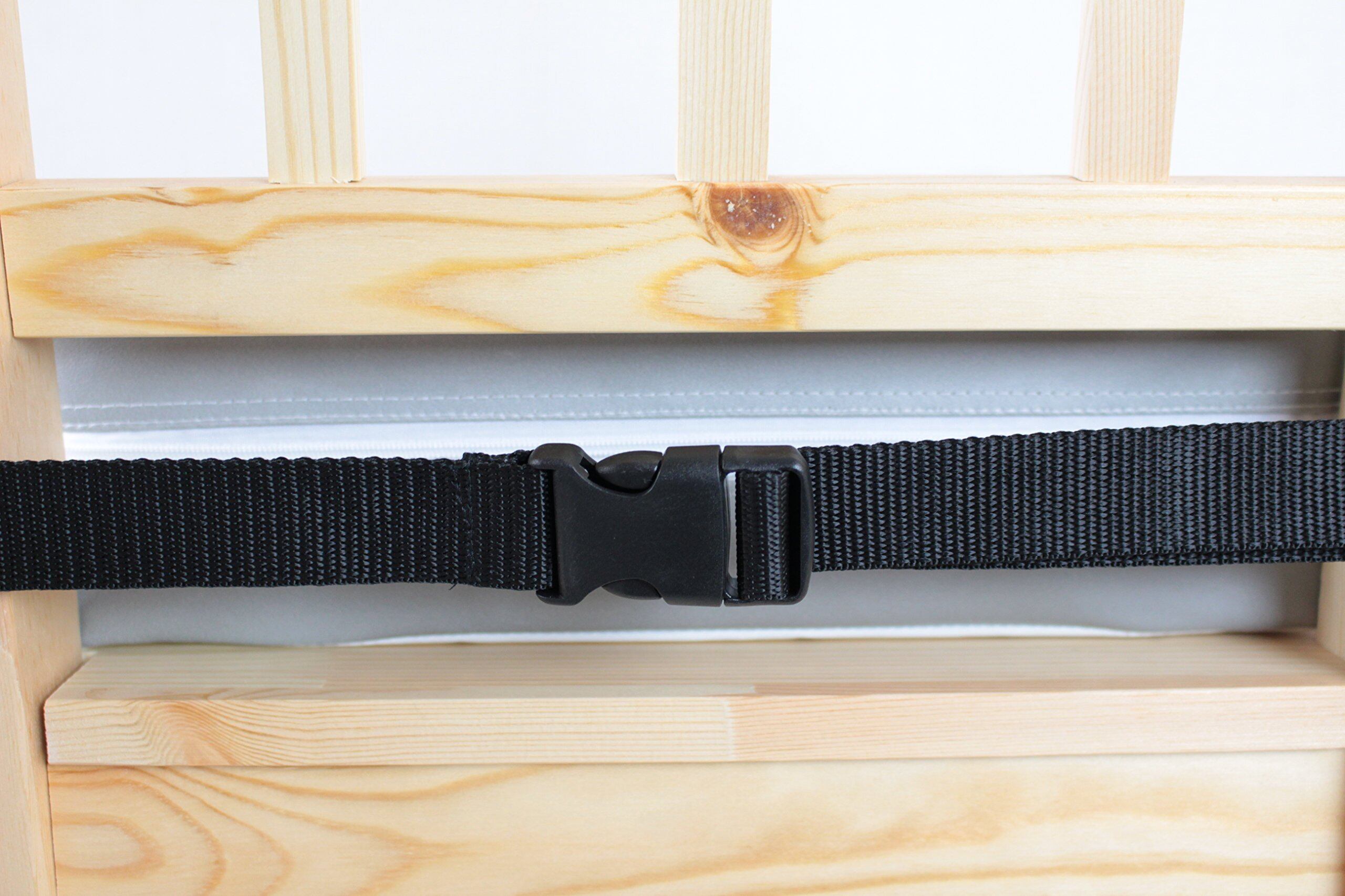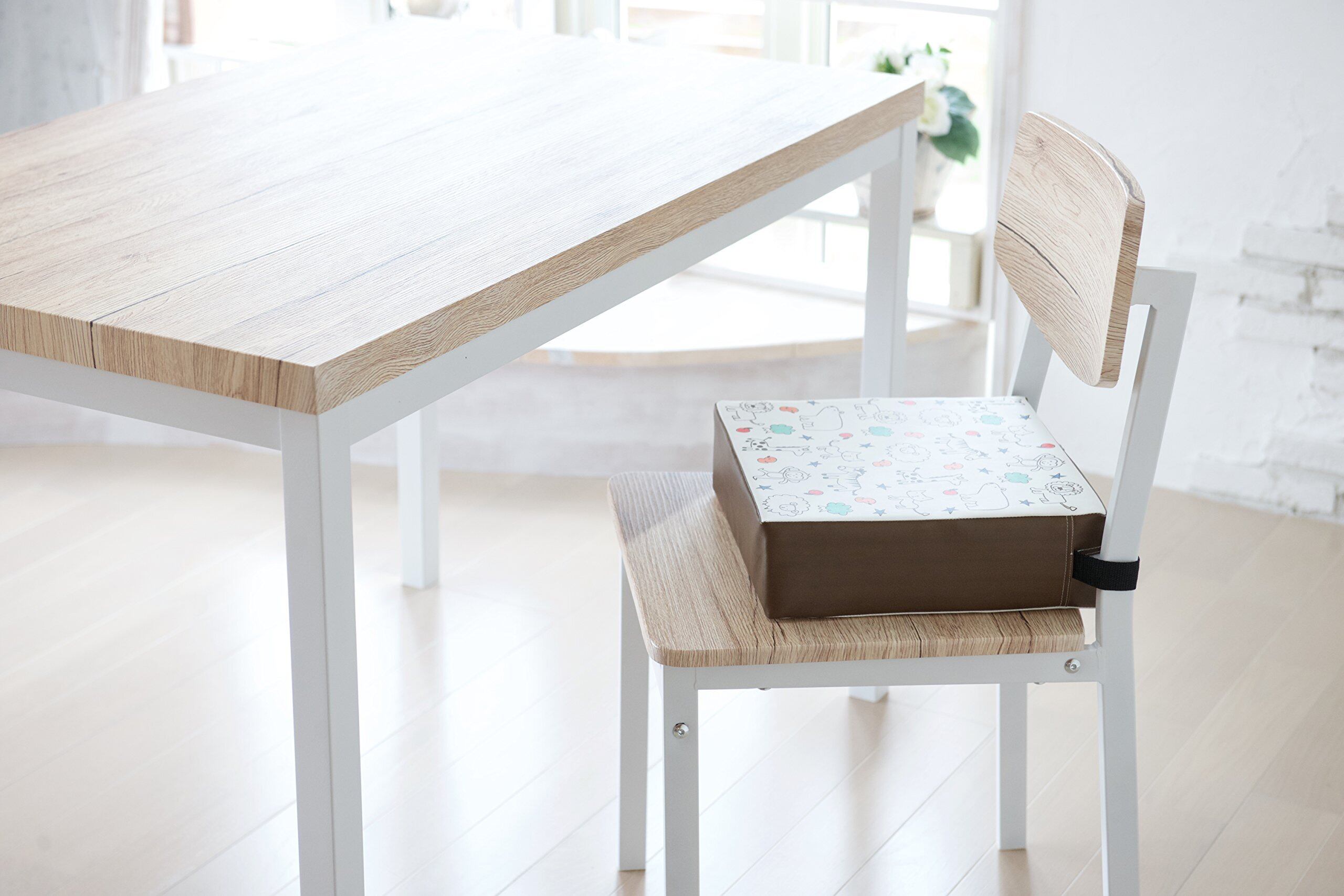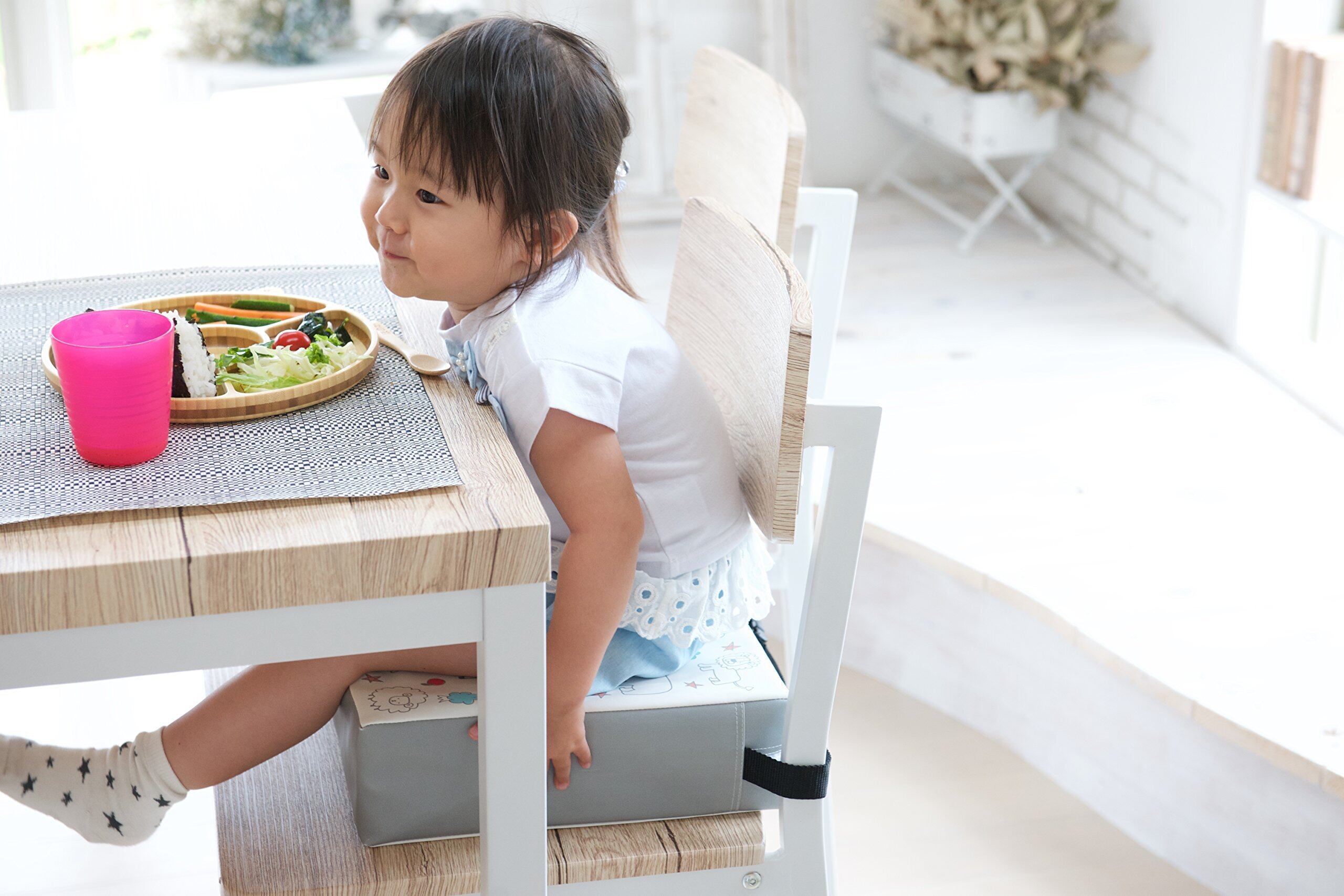 大人用のイスに乗せてベルトで固定するだけの簡単装着! お子さまの高さが2段階に調節できます。