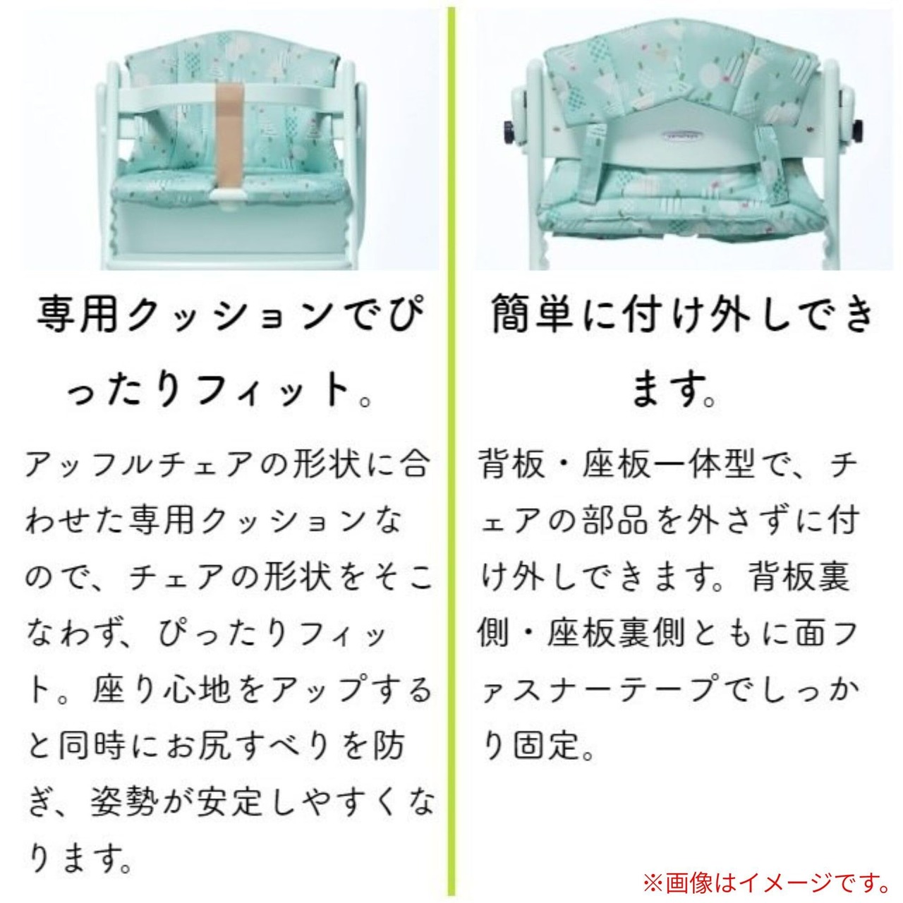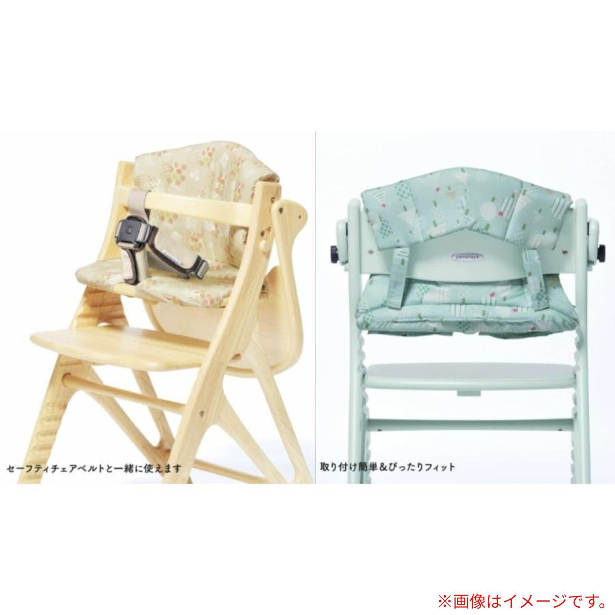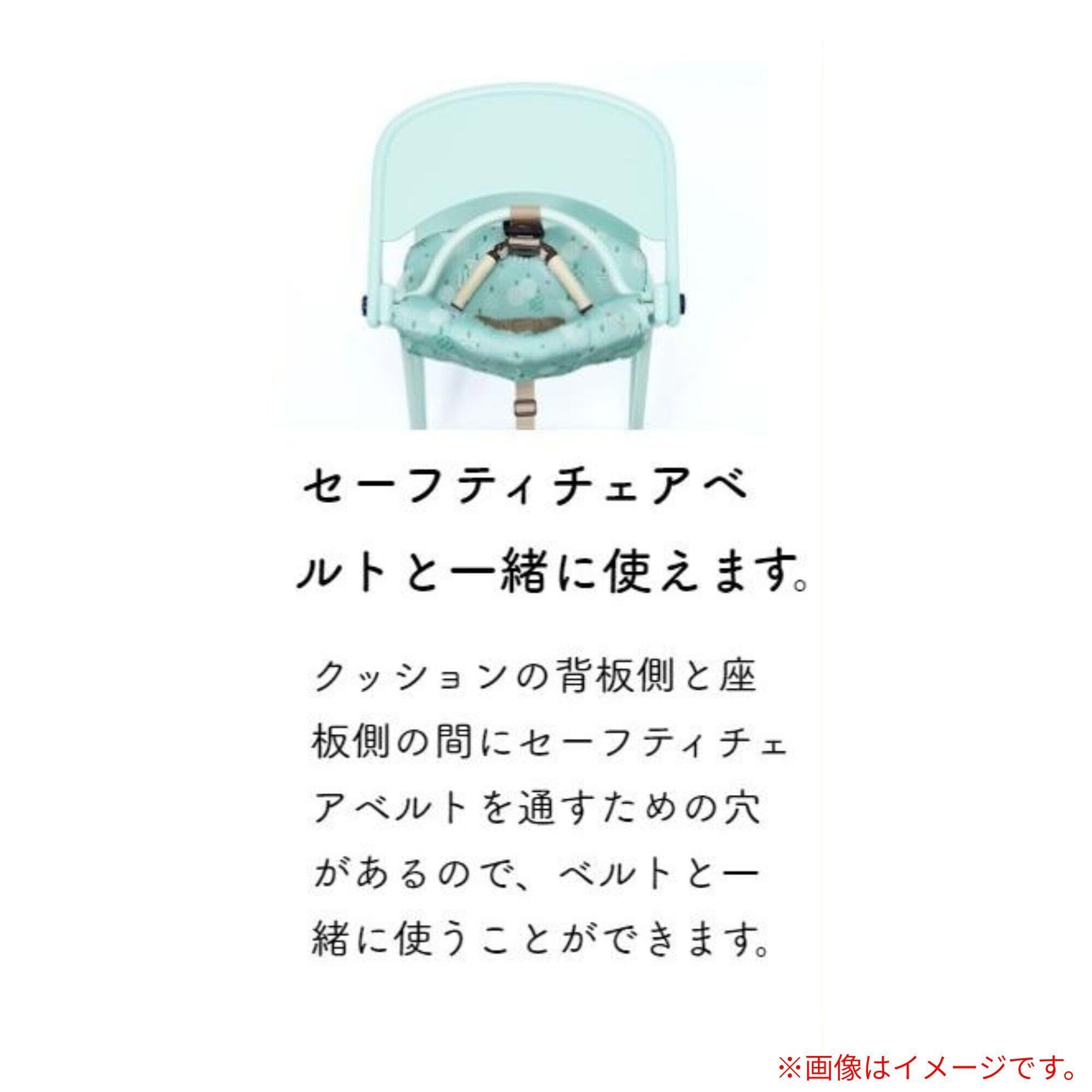 チェアの色との組み合わせをお楽しみいただけます。 チェアの部品を外さずに付け外しでき、お手入れ簡単でいつも清潔にたもてます。 背板と座板の間に別売のセーフティチェアベルトを通すための穴があるので、一緒にお使いいただけます。