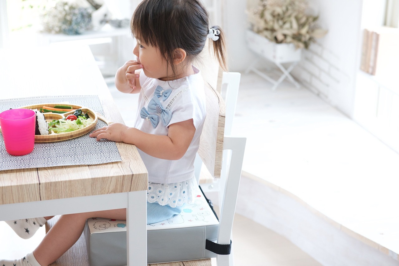 大人用のイスに乗せてベルトで固定するだけの簡単装着! お子さまの高さが2段階に調節できます。