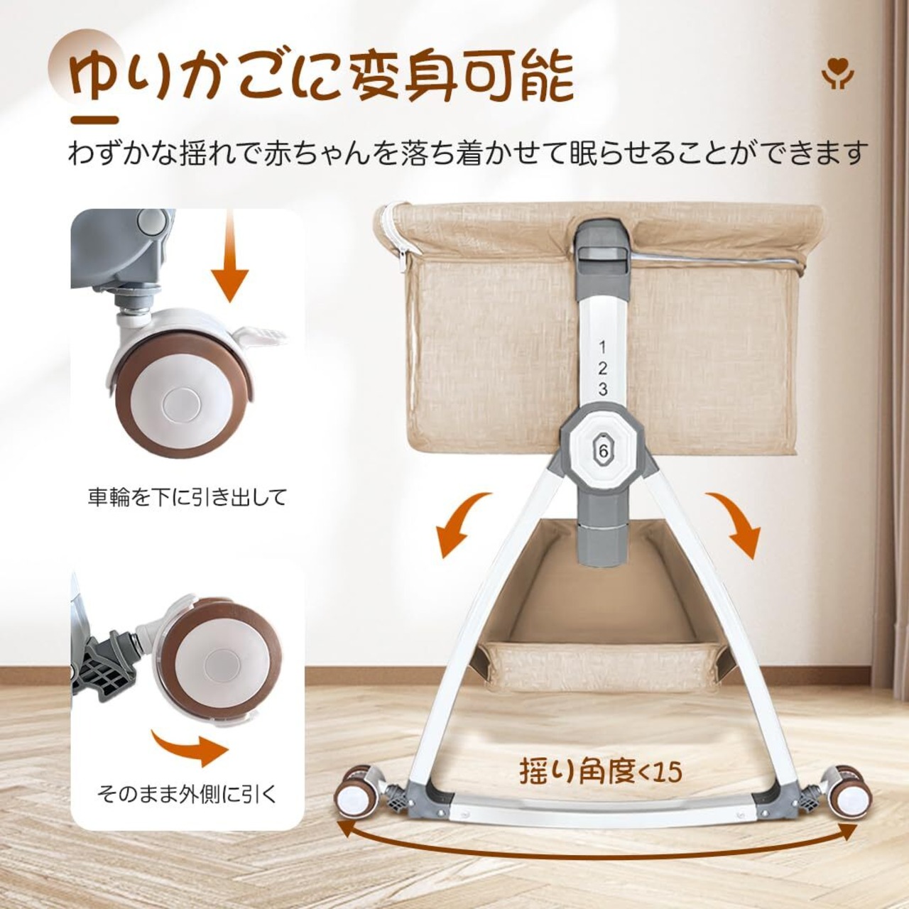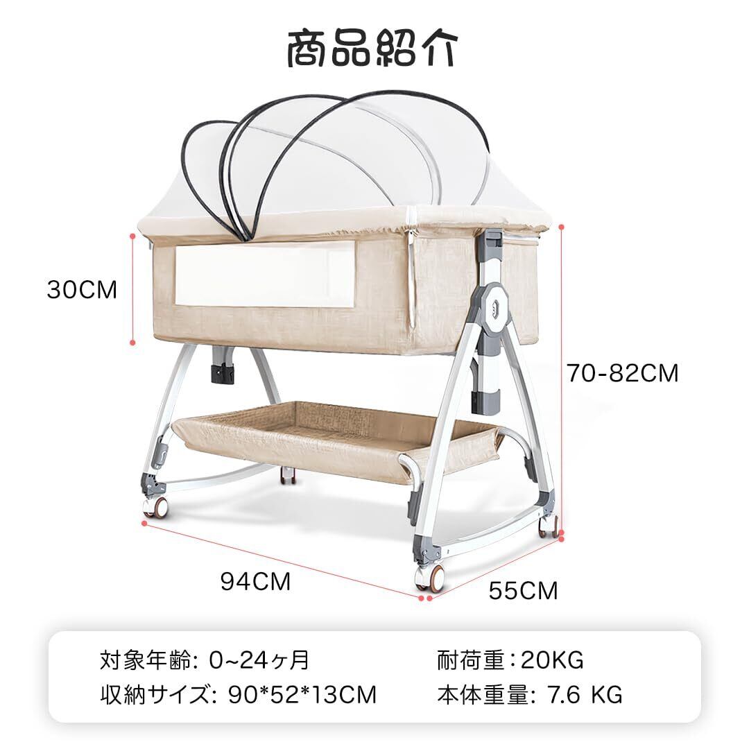 【高さ調節可能】高さ6段階調節可能で、市場に出回っているベッドタイプの99%と互換性があります。キャスターの安全ブレーキをロックする、お子様を快適な環境で眠らせてあげられます。ーベッドは斜めの調節可能で、新生児に対してミルクの吐くことを防ぐことができます。