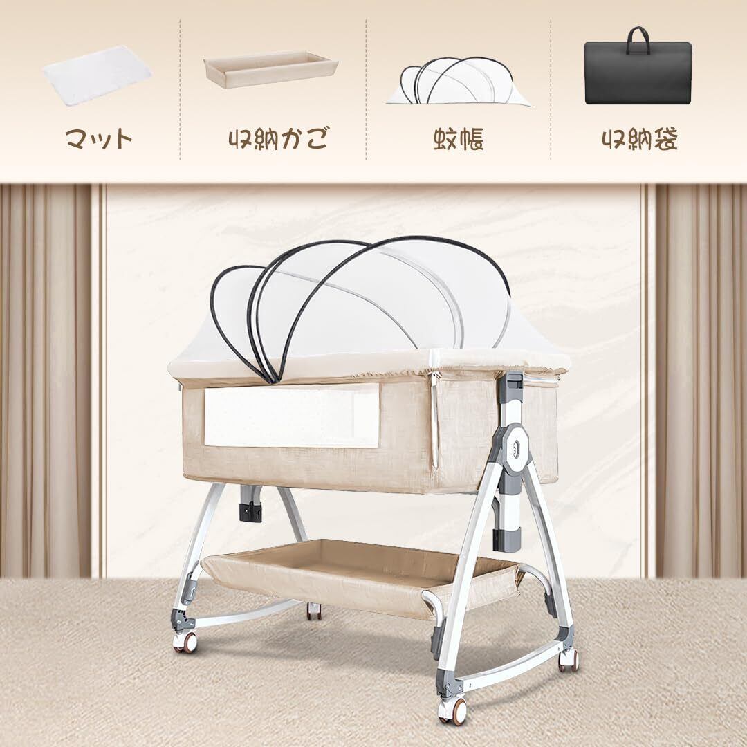 【新着商品】Oqhvup ベビーベッド 添い寝 乳児用ベッド 新生児ベッド 高さ6段調節可能 蚊帳 通気性 多機能 組み立て簡単 収納便利 持ち運び 洗濯可能 収納バスケット キャスタ付き 睡吐防止 軽量 幼児 新生児用 出産祝い プレゼント 0ヶ月 ~ 24ヶ月 (ベージュ)