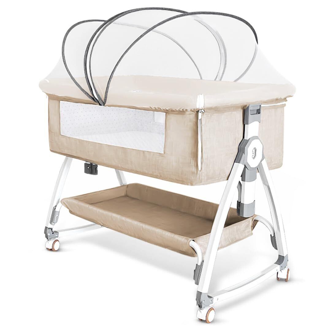 Oqhvup ベビーベッド 添い寝 乳児用ベッド 新生児ベッド 高さ6段調節可能 蚊帳 通気性 多機能 組み立て簡単 収納便利 持ち運び 洗濯可能 収納バスケット キャスタ付き 睡吐防止 軽量 幼児 新生児用 出産祝い プレゼント 0ヶ月 ~ 24ヶ月 (ベージュ)