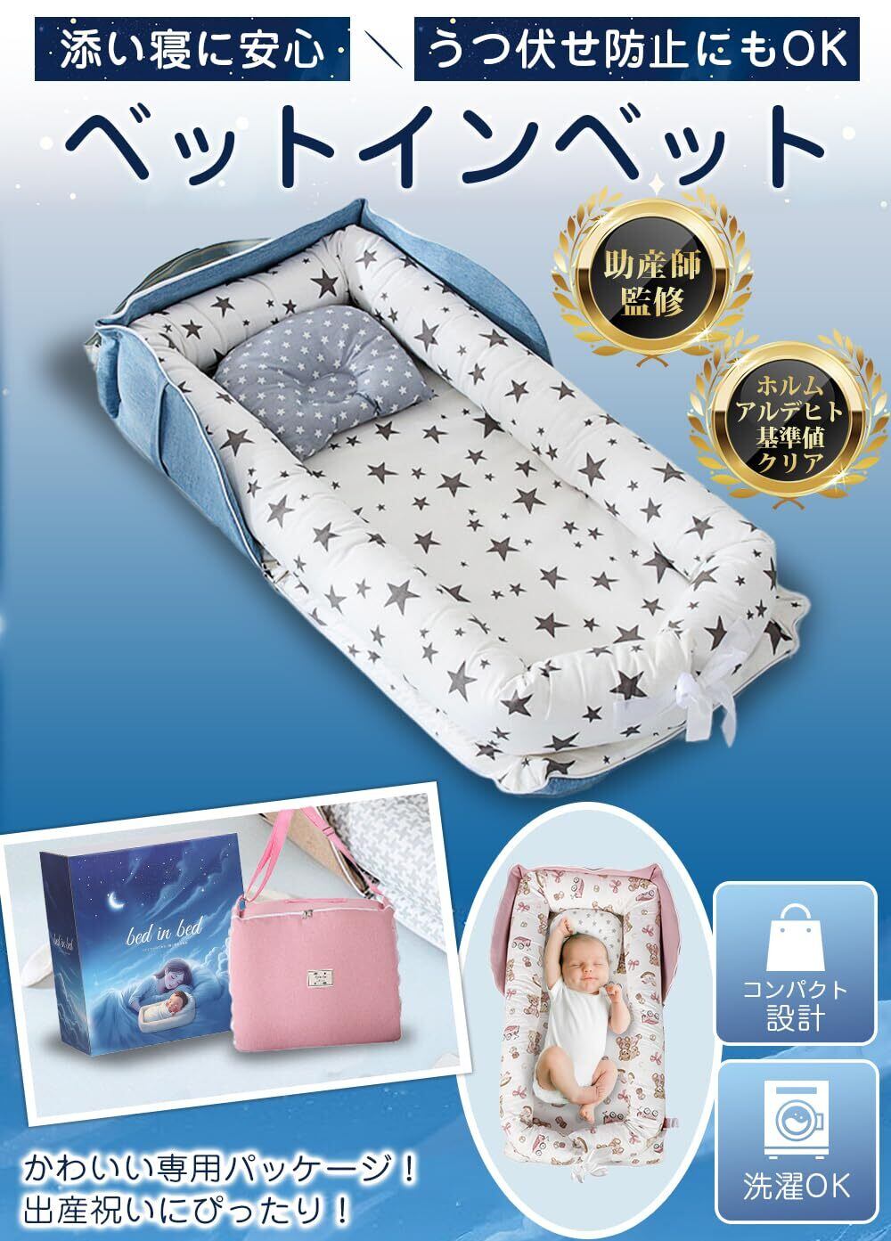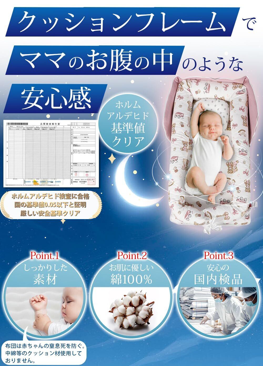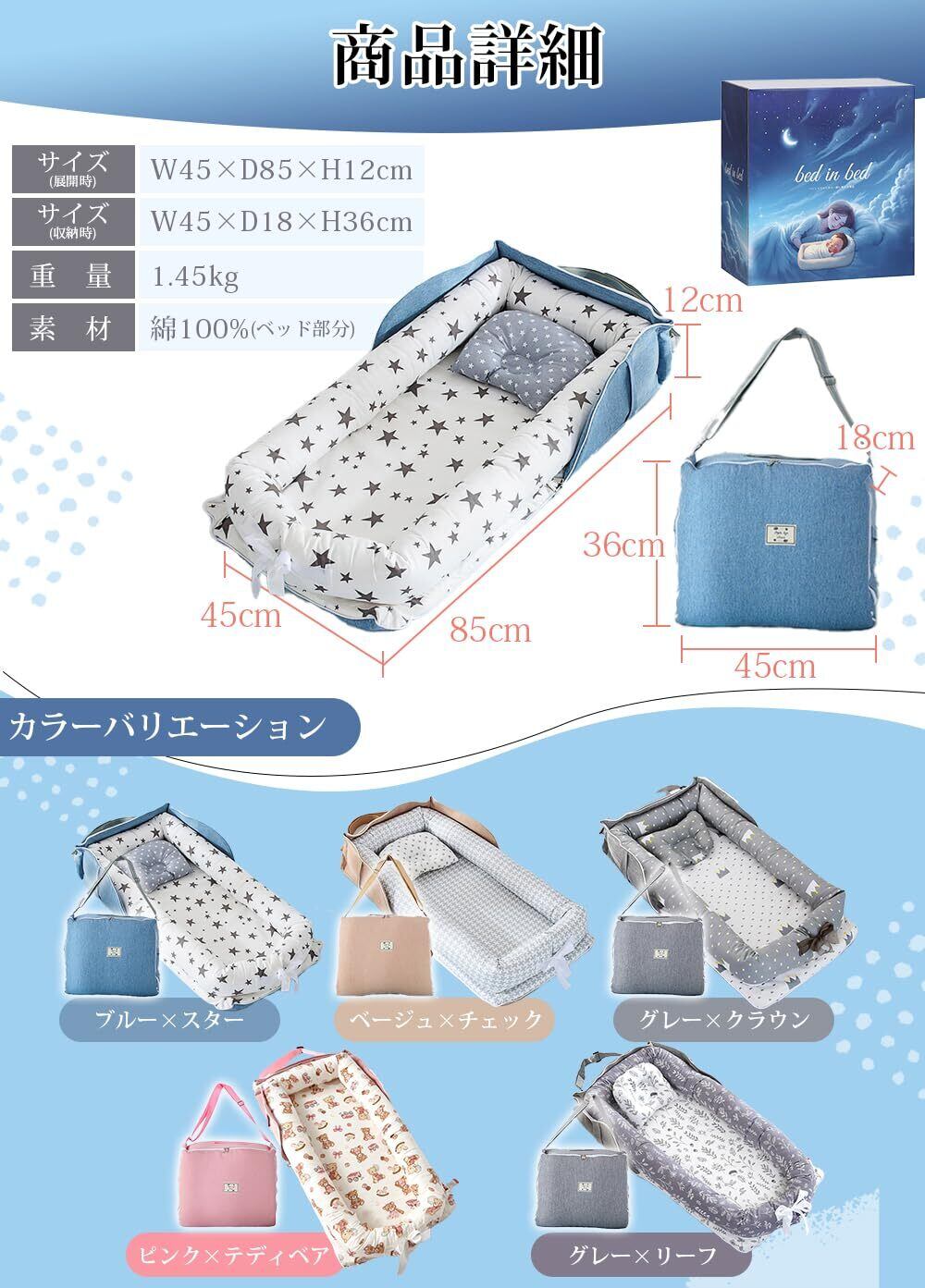 赤ちゃんの寝場所をすぐに確保できるベッドインベッド。 折りたたみできて軽く、付属の収納バッグで持ち運びも簡単です。 自宅のベッドやリビング、実家への帰省・旅行先でも、赤ちゃんの簡易ベッドとして活躍。 クッションフレームは取り外して洗濯可能、いつでも清潔に保てます。 本体サイズ:開いたときは約85×45×12cm バッグにすると、約18×45×36cm 0–18ヶ月の使用を想定したコンパクト設計。 赤ちゃんに触れる部分は、肌あたりの良い綿100%を採用し、日中のお昼寝や見守り時のサポートに。 ※本品は赤ちゃんの寝姿勢をサポートする簡易寝具です。使用中は必ず保護者の目の届く場所でご利用ください。