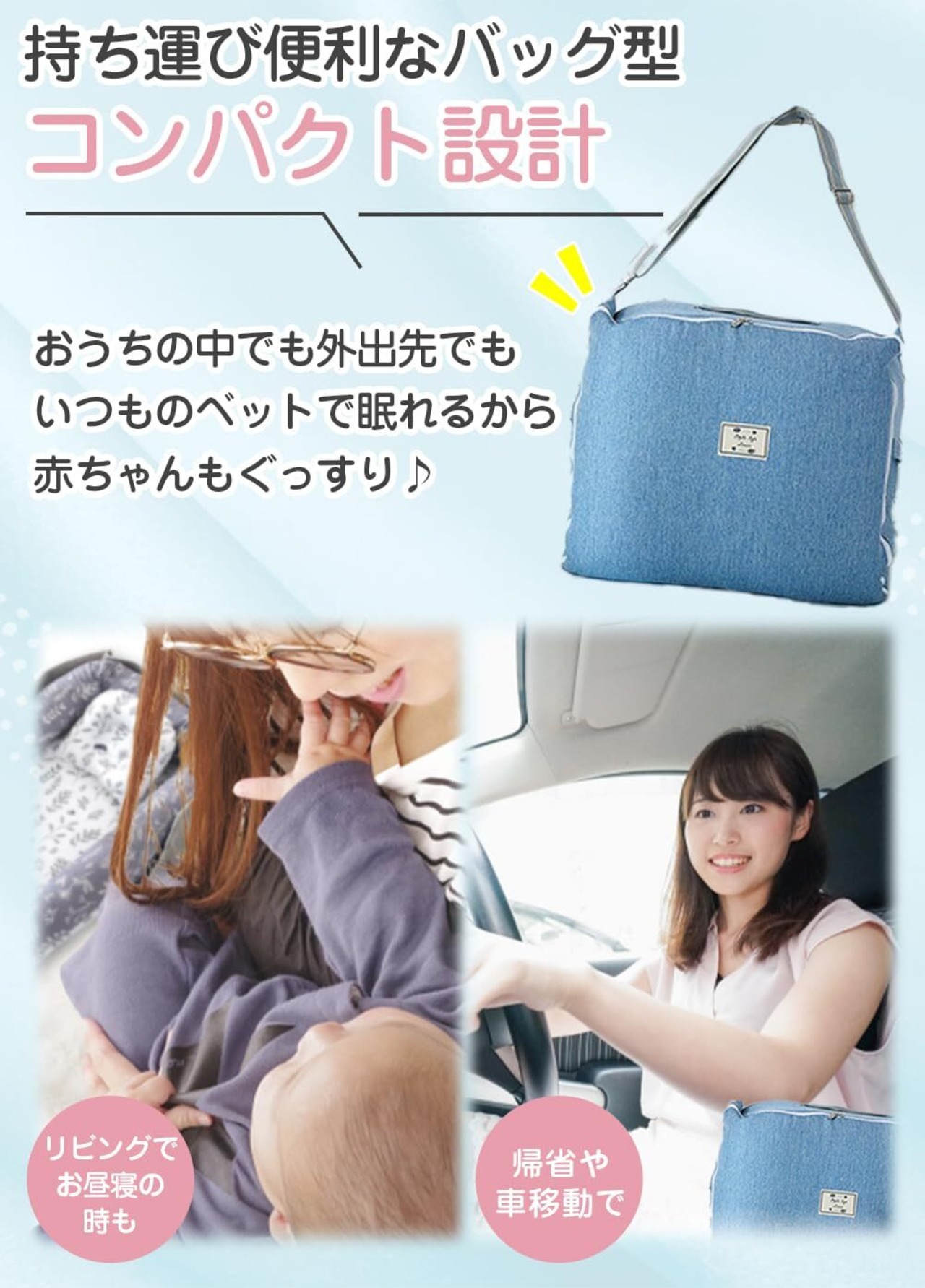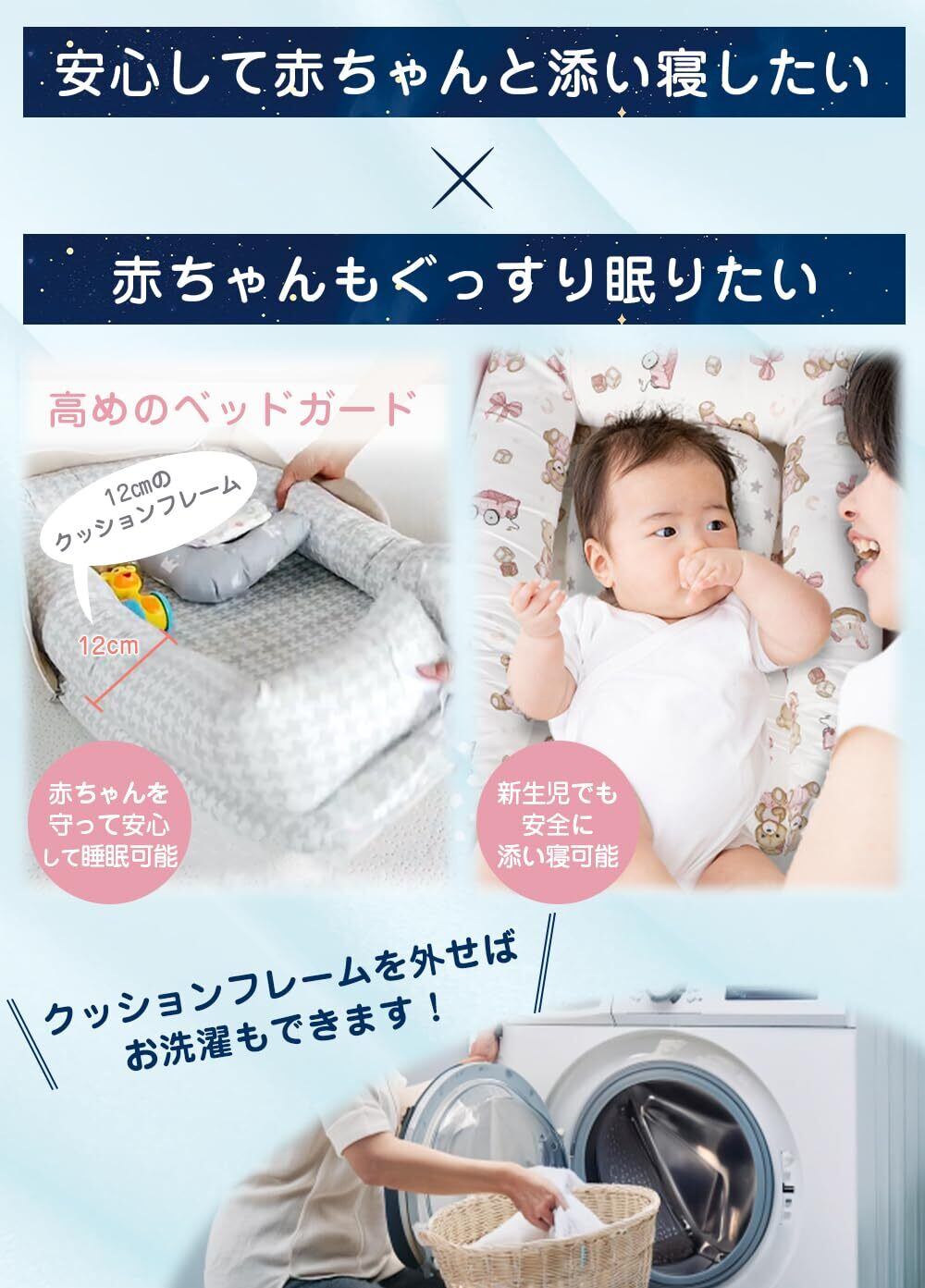 使えるシーン:自宅ベッド上の添い寝サポート、リビングでのお昼寝、里帰り・旅行時の簡易ベッド