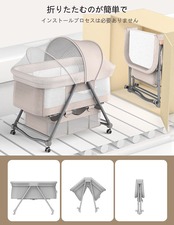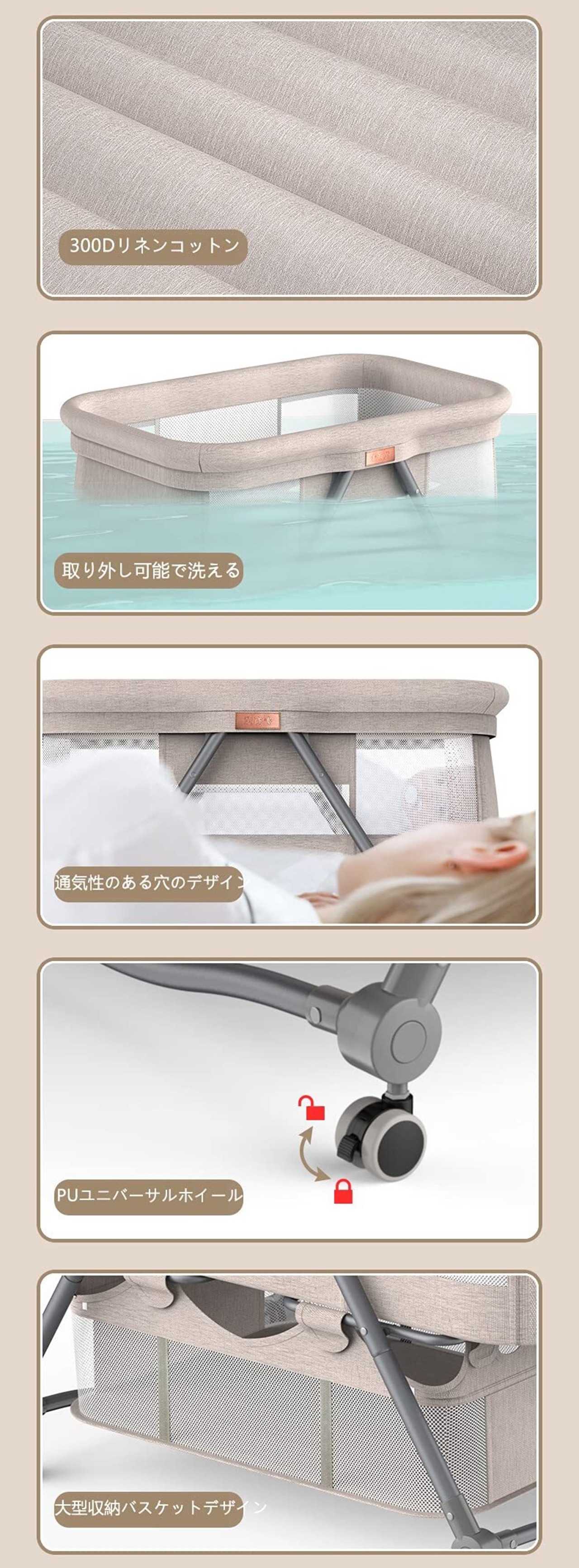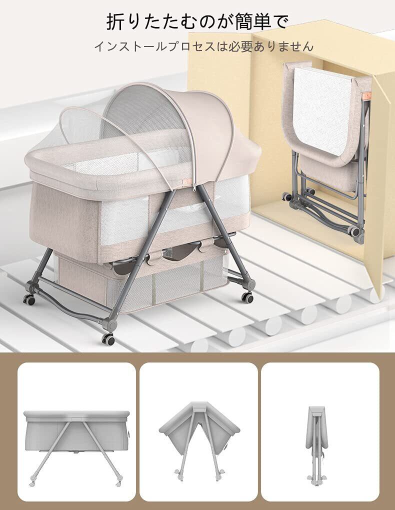 「多機能」①揺籃に変身可能。②大容量な収納かごつき、小物収納便利。③キャスターとブレーキ付き、移動便利。④四段階高さ調節可能。⑤カバーを外して洗濯可能。➅ベッドは少し傾き、新生児に対してミルクの吐くことを防ぐことができます。