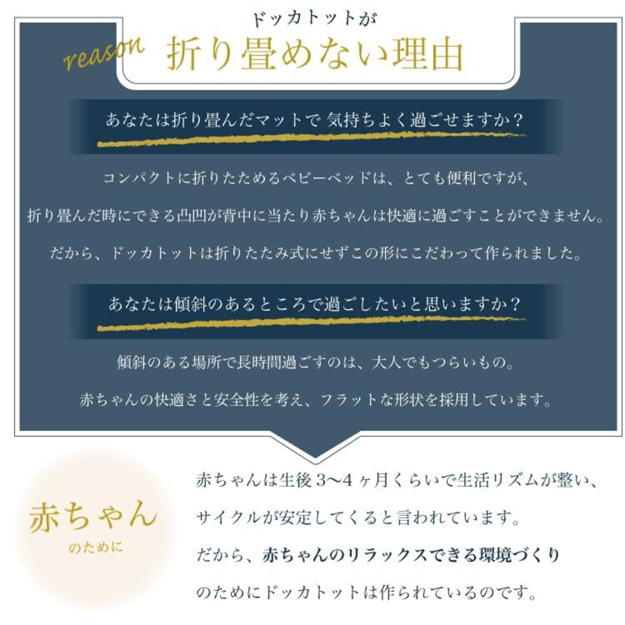 ドッカトット デラックスは、0~8ヶ月ごろまでの赤ちゃんに対応しています。赤ちゃんが頻繁に寝返りをするようになったら、安全のため使用を終了してください。