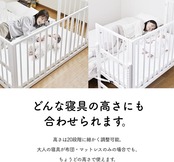そんな添い寝ができるベビーベッド。大人のベッドの高さと合わせ、段差なくつなげて使用可能。