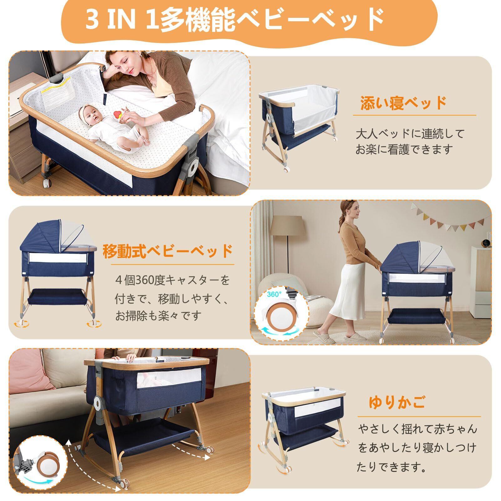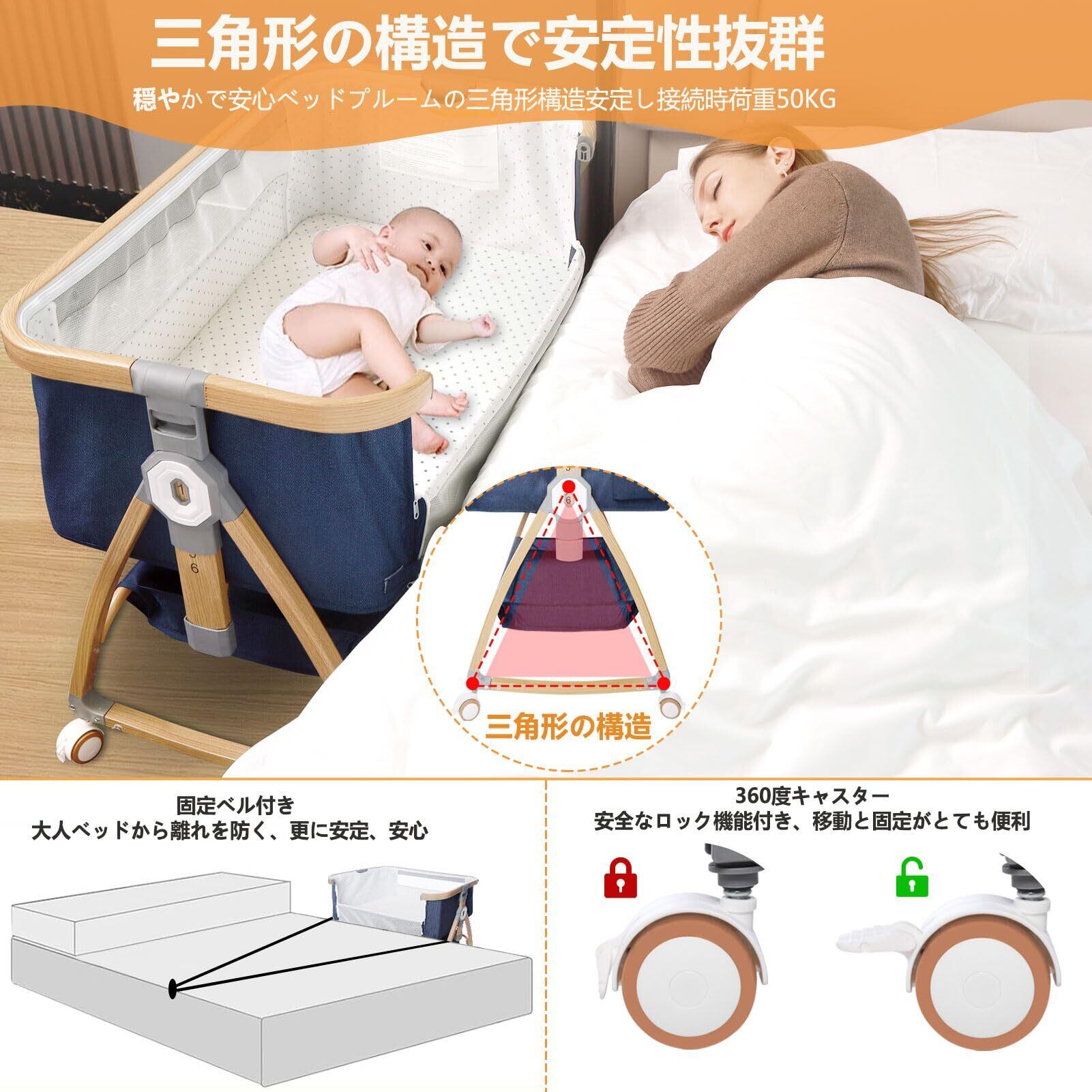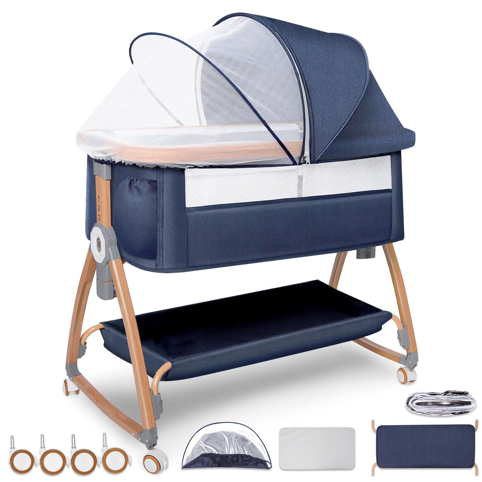 【在庫セール】2025最新 ベビーベッド 添い寝ベッド 折畳み 高さ6段調節可能 乳児用ベッド 新生児ベッド ゆりかご 多機能 コンパクト 持ち運びしやすい 通気性 洗濯可能 吐き戻し予防 組み立て不要 0ヶ月~24ヶ月赤ちゃん寝具 babybed 収納かご/マットレス/固定ベルト/蚊帳/キャスター付き 出産祝い プレゼント SGS認証済 日本語取扱説明書付き (木目調フレーム, ブルー)