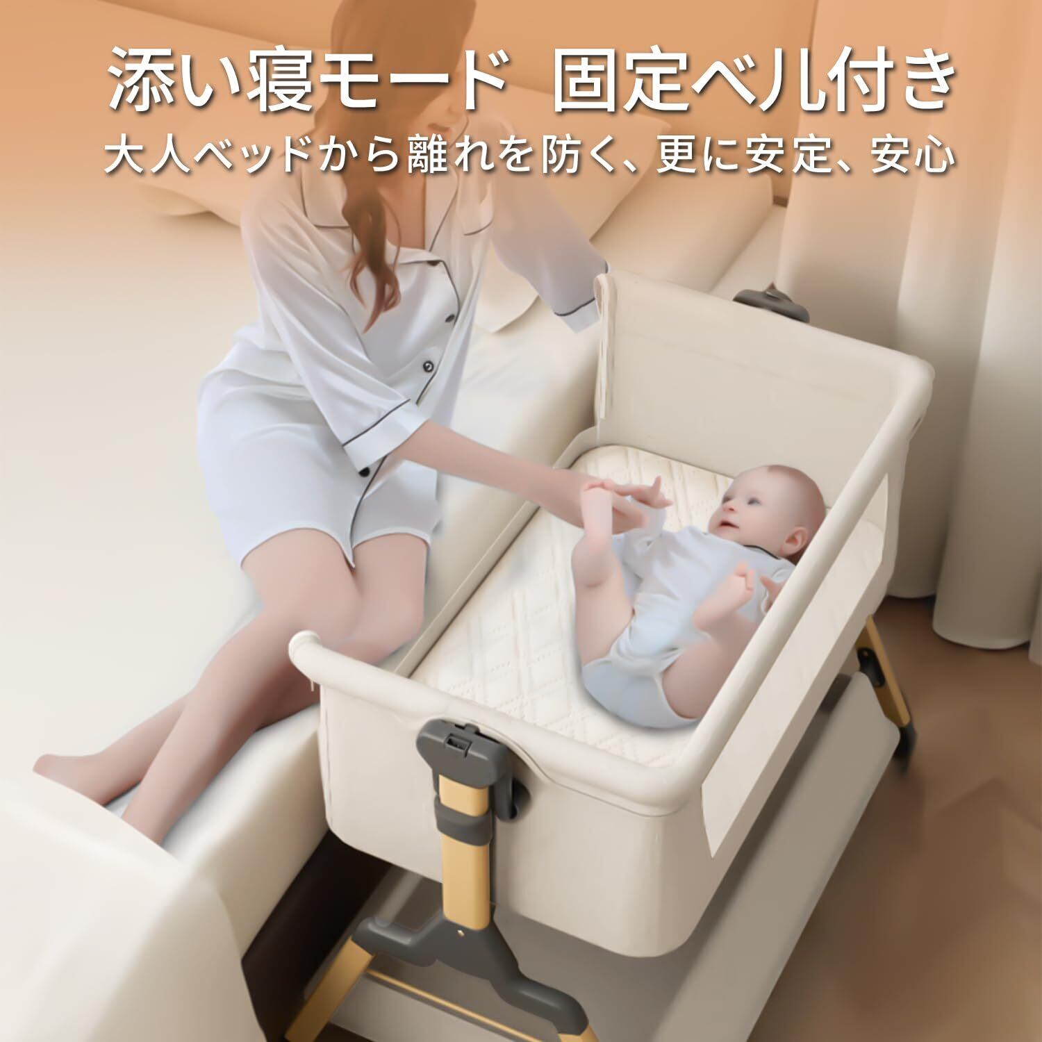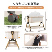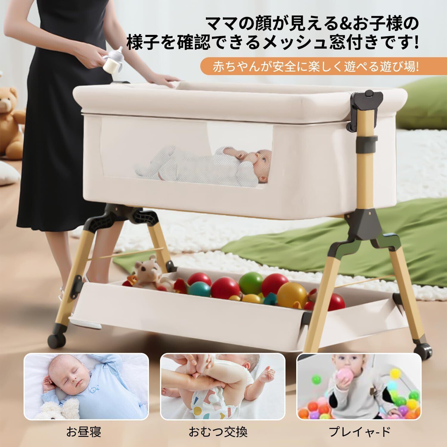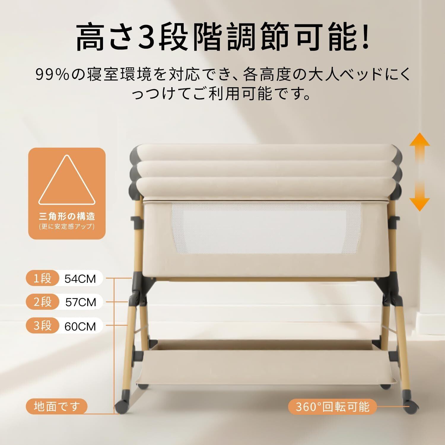 【高さ調節可能・ゆりかごに変身可能】高さ3段階調節可能で、各高度の大人ベッドにくっつけてご利用可能です。ーベッドは斜めの調節可能で、新生児に対してミルクの吐くことを防ぐことができます。三角形の構造+ 4点ポジショニングサポートはピラミッドと同じくらい安定しています。固定ベルト付き、大人ベッドから離れを防ぐ、くっつける可能、更に安定、安心。揺りかご機能付き、わずかな揺れで赤ちゃんはすぐに眠りにおちます。